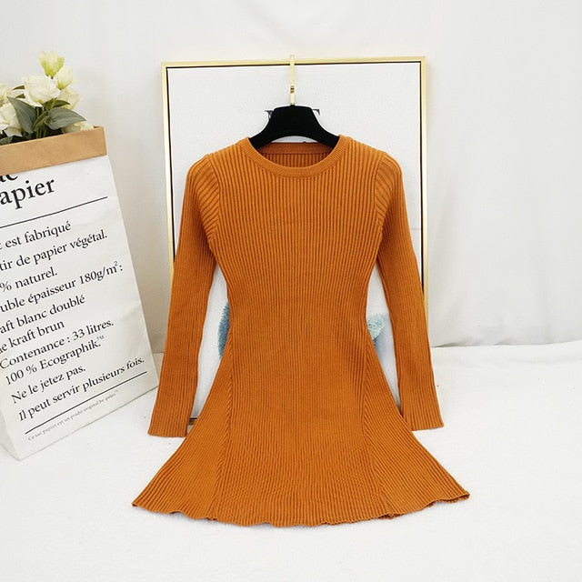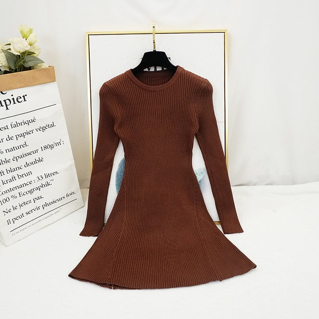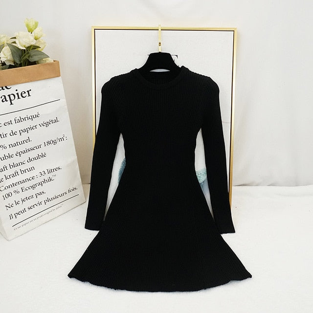 Long-Sleeved Solid O-Neck Collar Mini Dress with Nylon Acrylic Material