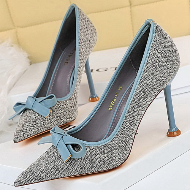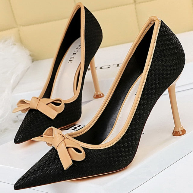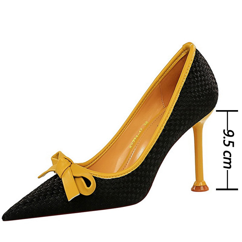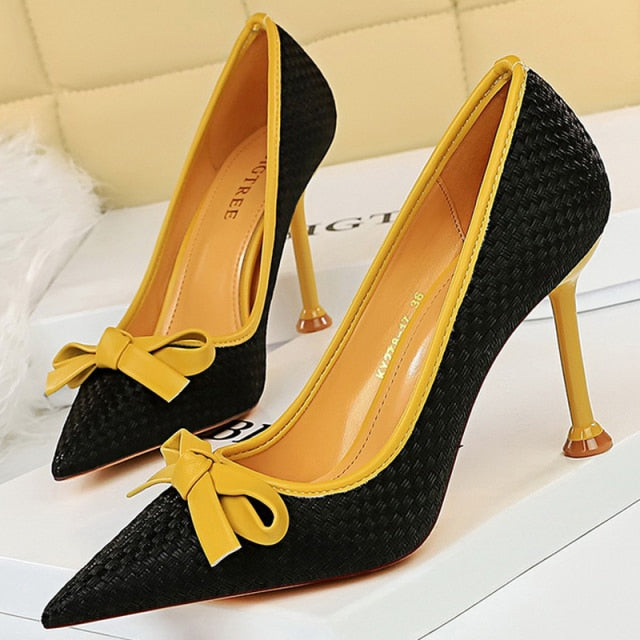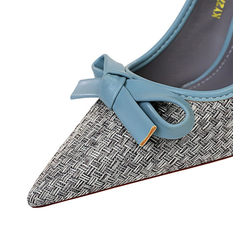 Ribbon Decorated Pumps with Geometric Pattern, Pointed Toe, and PU Material
