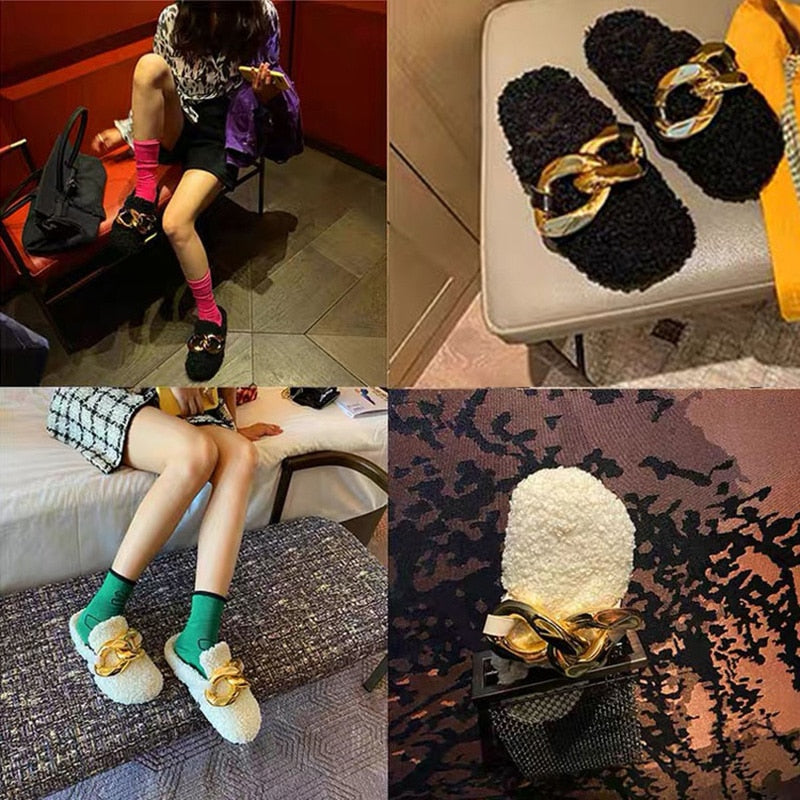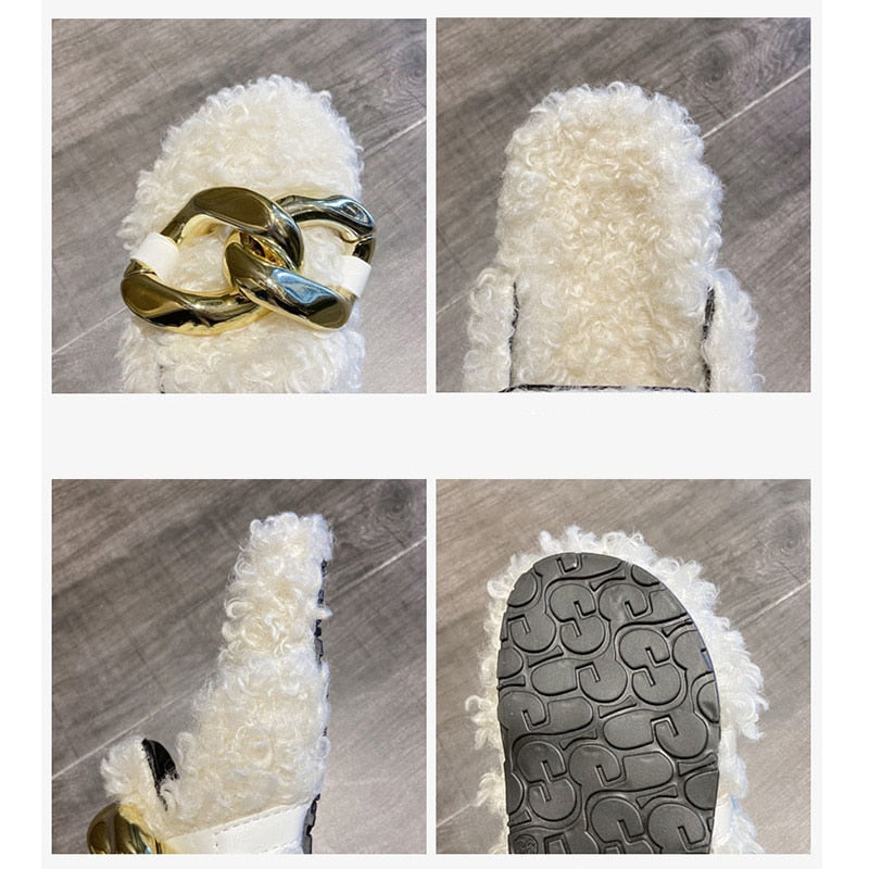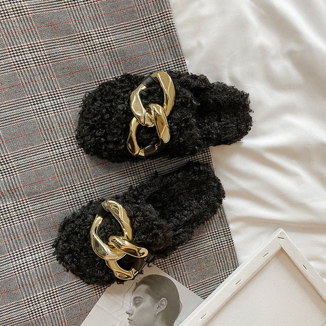 Solid Color Slip-On Sandal with Chain Decoration, Plush, Rubber, and Fur Material