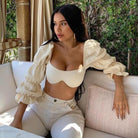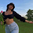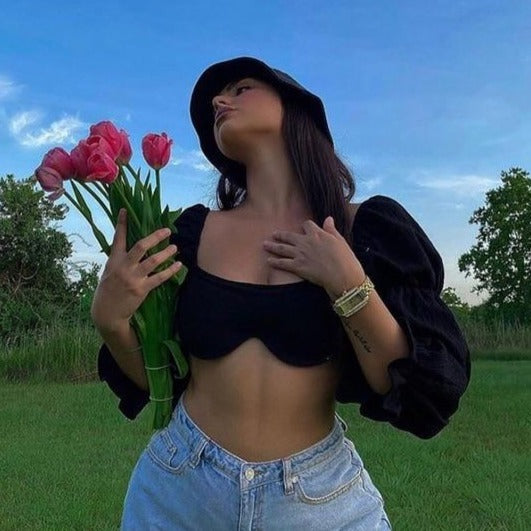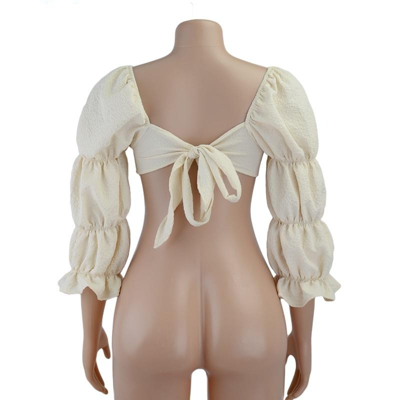 Puff Sleeve Crop Top with Ties Closure and Square Collar
