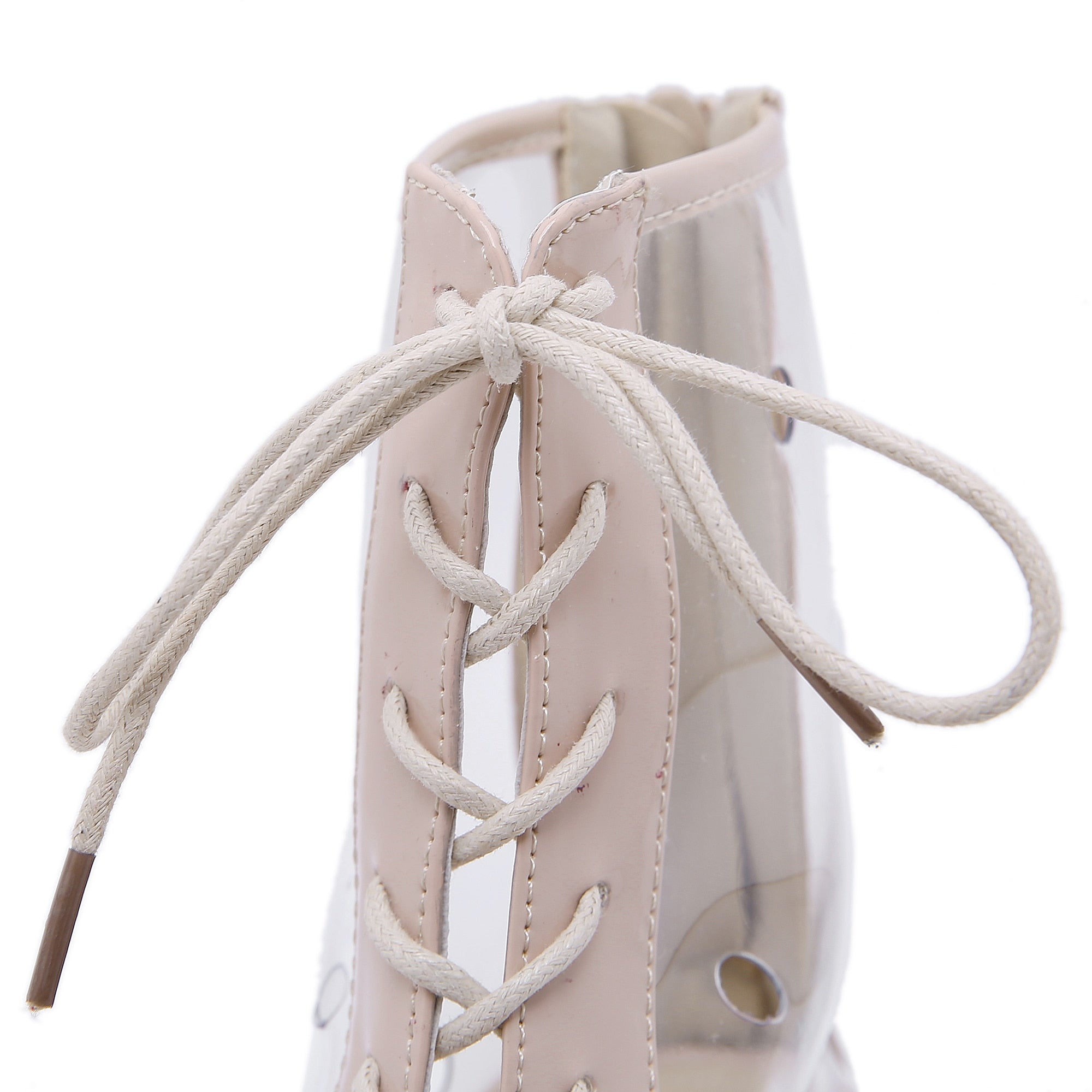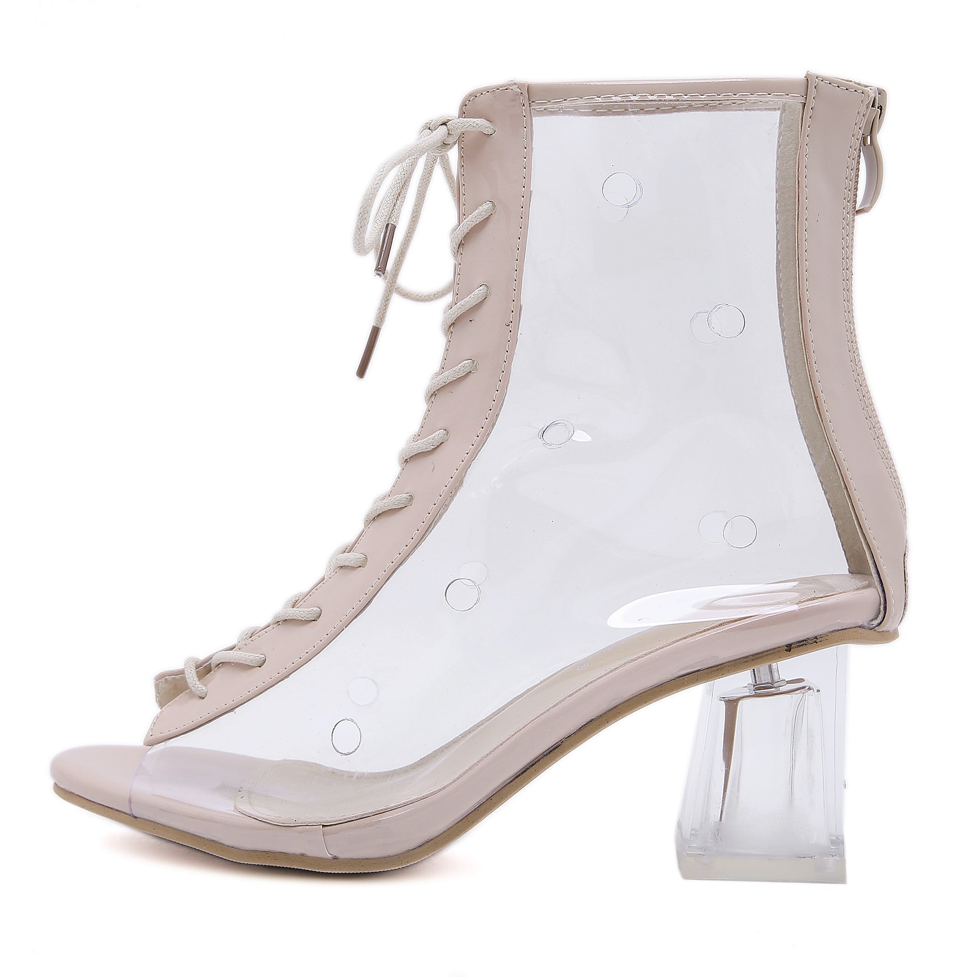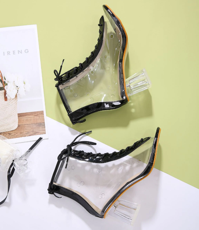 These ankle boots are simply beautiful. The transparent style is a sure attention grabber. The lace-up closure adds a dressy look. The hollow-out and open-toe design ensures a breathable and makes it more comfortable. The square chunky heels also add a unique charm to these boots.