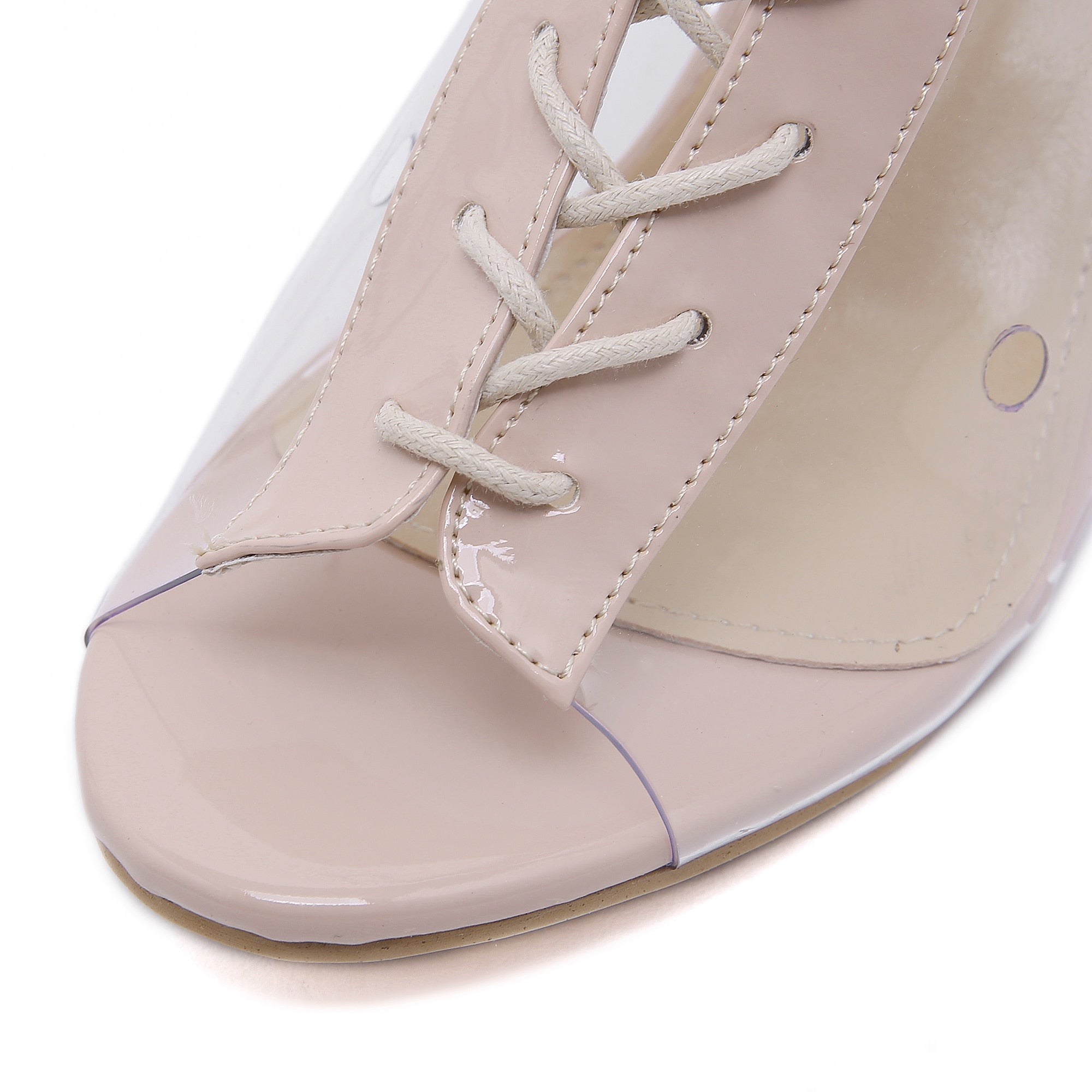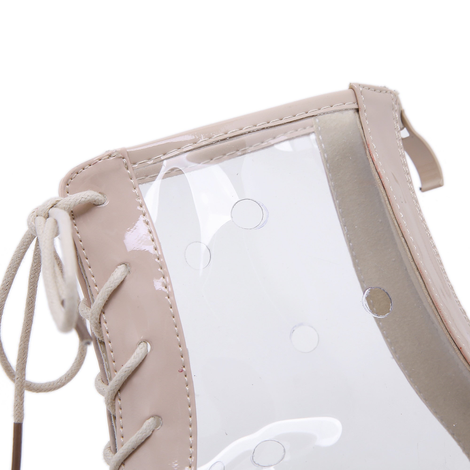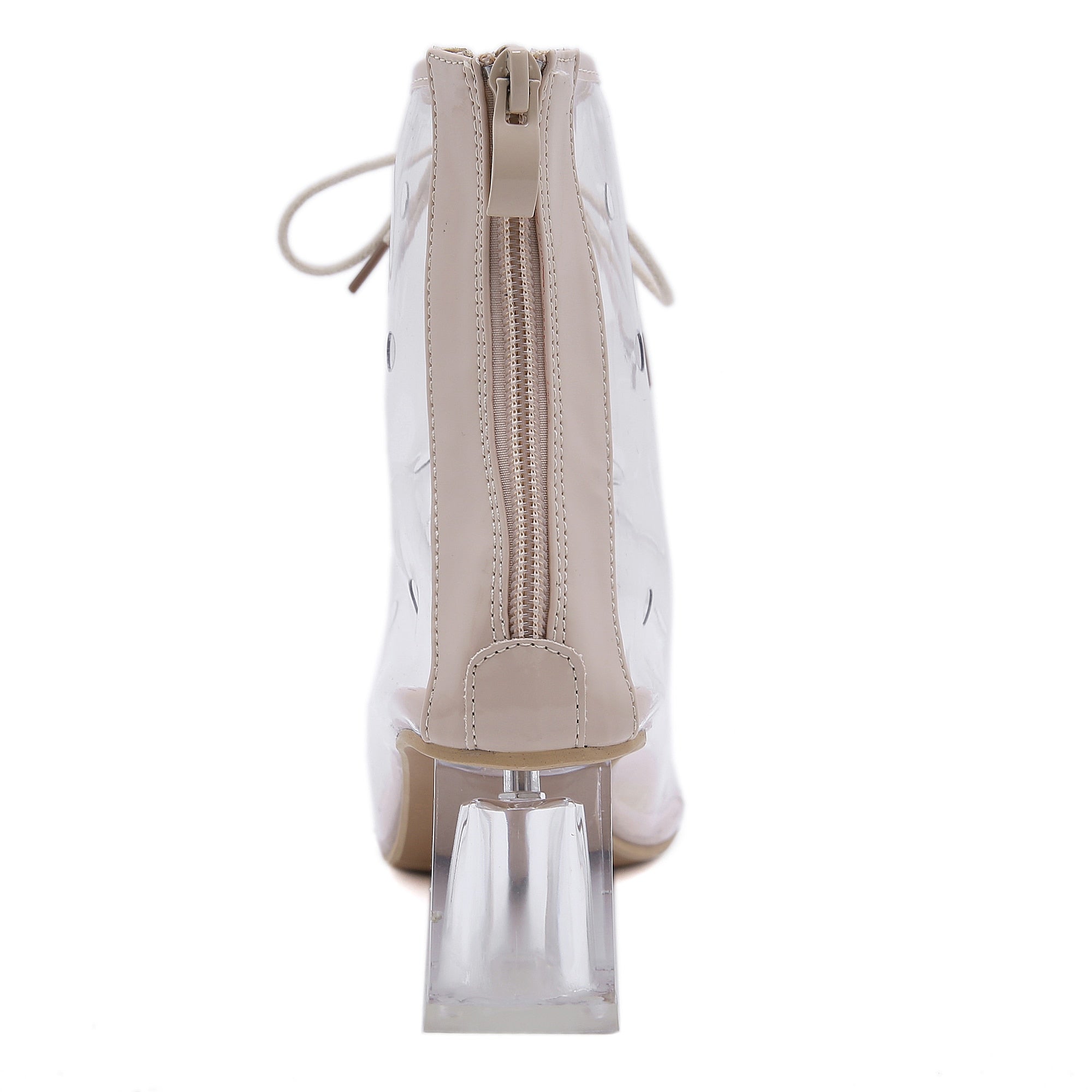 These ankle boots are simply beautiful. The transparent style is a sure attention grabber. The lace-up closure adds a dressy look. The hollow-out and open-toe design ensures a breathable and makes it more comfortable. The square chunky heels also add a unique charm to these boots.