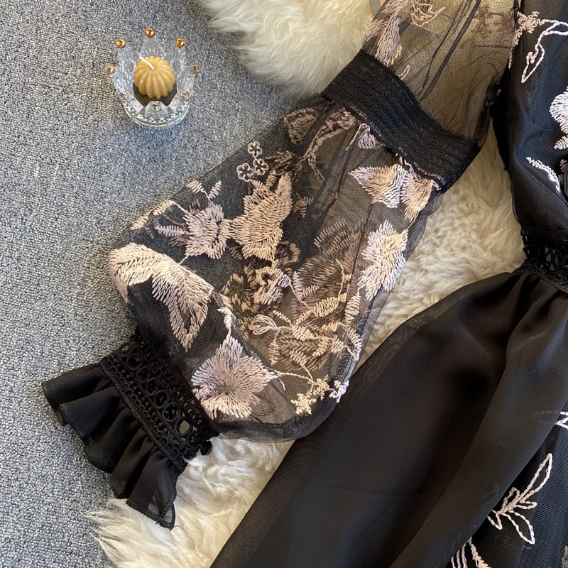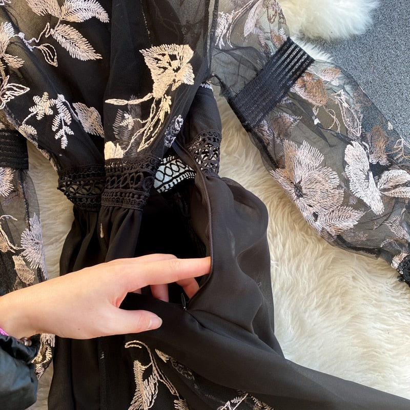 Set the tone for a day full of great memories with this gorgeous dress. A unique floral embroidery adds a touch of romance to this stunning dress. The see-through floral sleeve helps to flatter your figure and will make you stand out from the crowd.