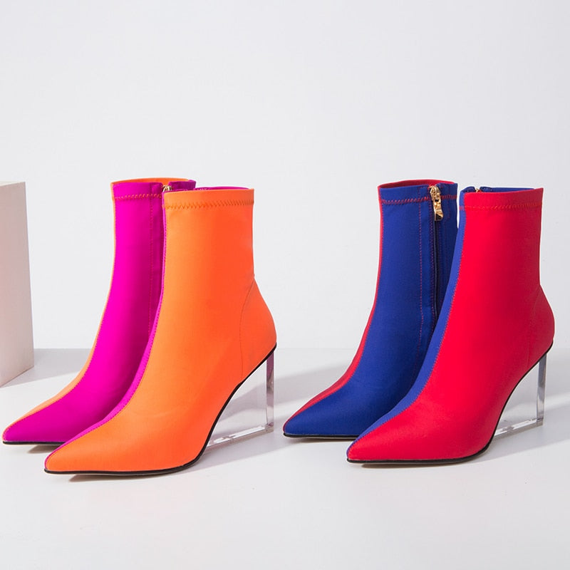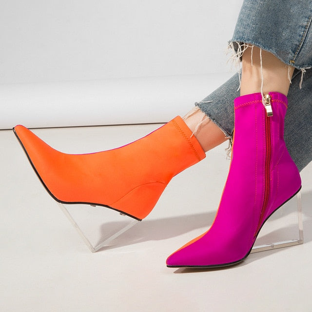 Stretch Fabric Mixed Color Pattern Pointed Toe Ankle Boots