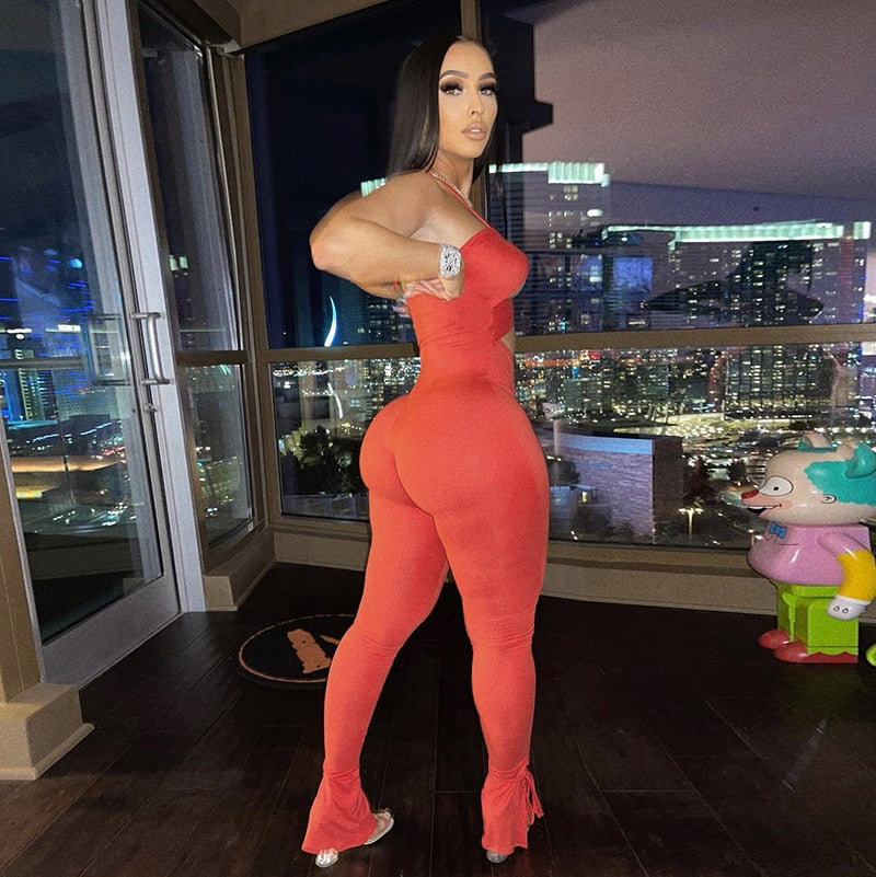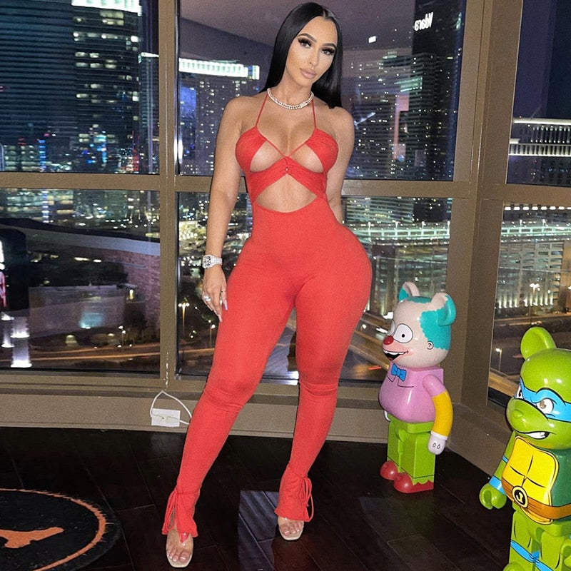 Full-Length Cotton Polyester Sleeveless Jumpsuit with Halter Spaghetti Strap and Hollow Out Design