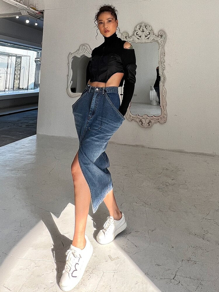This is a denim skirt with pockets. It is a solid color and features a midi length. This skirt is perfect for everyday wear and looks great with anything from a button-down shirt to a sweater.