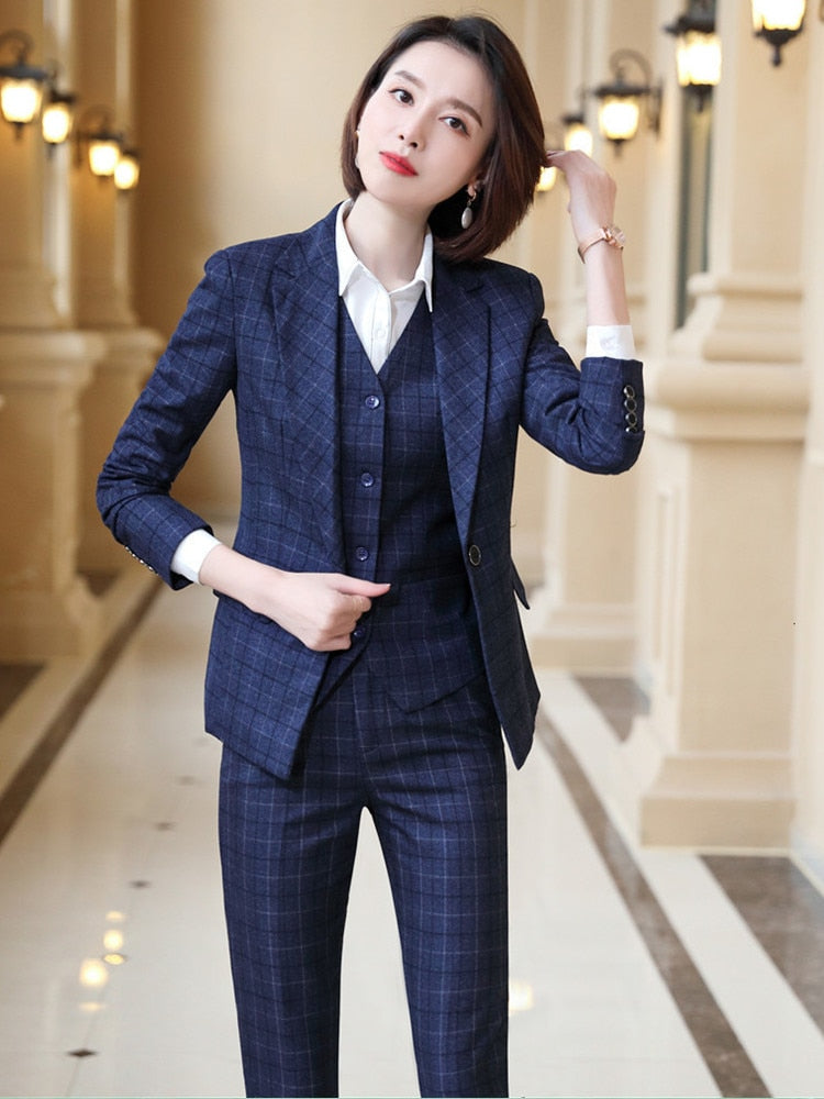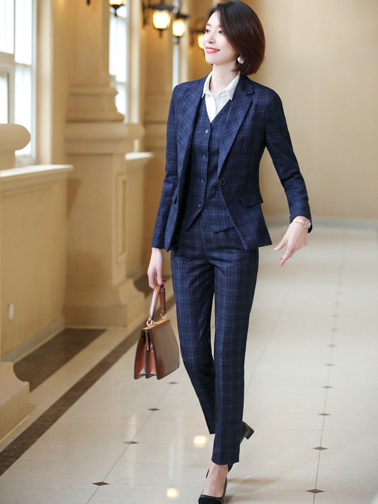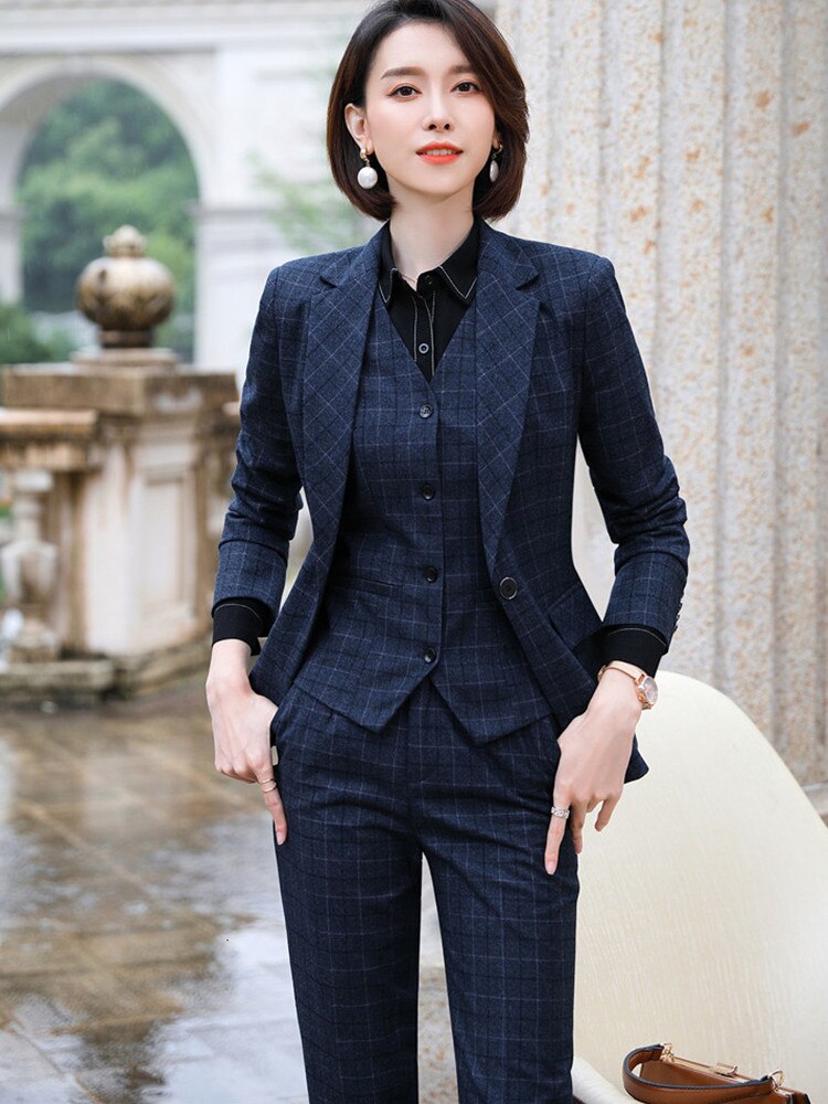 A shapely yet comfortable fit is achieved from the tailored pants and blazer. A slim lapel adds a stylish touch to the vest.