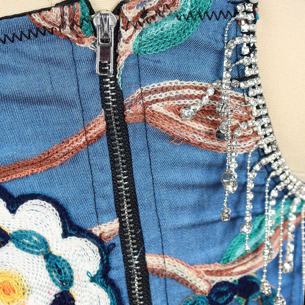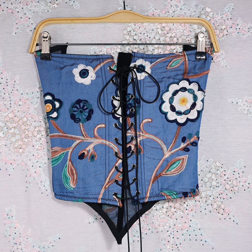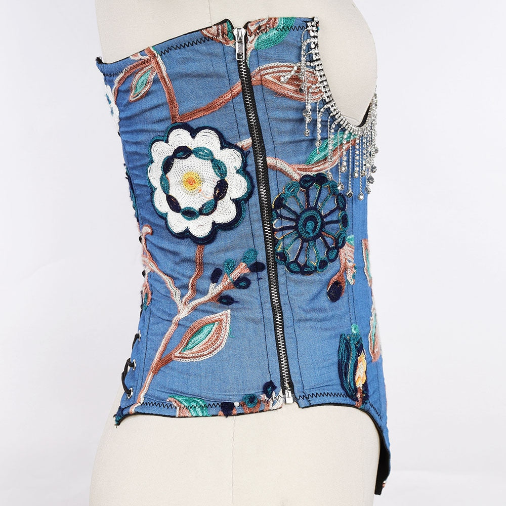 Our brand new women's corset top is a gorgeous and versatile piece. The blue cotton denim fabric is stretchy and soft, and the delicate floral embroidery is a feminine touch. The top is strapless and features a rhinestone tassel decoration on the straps.