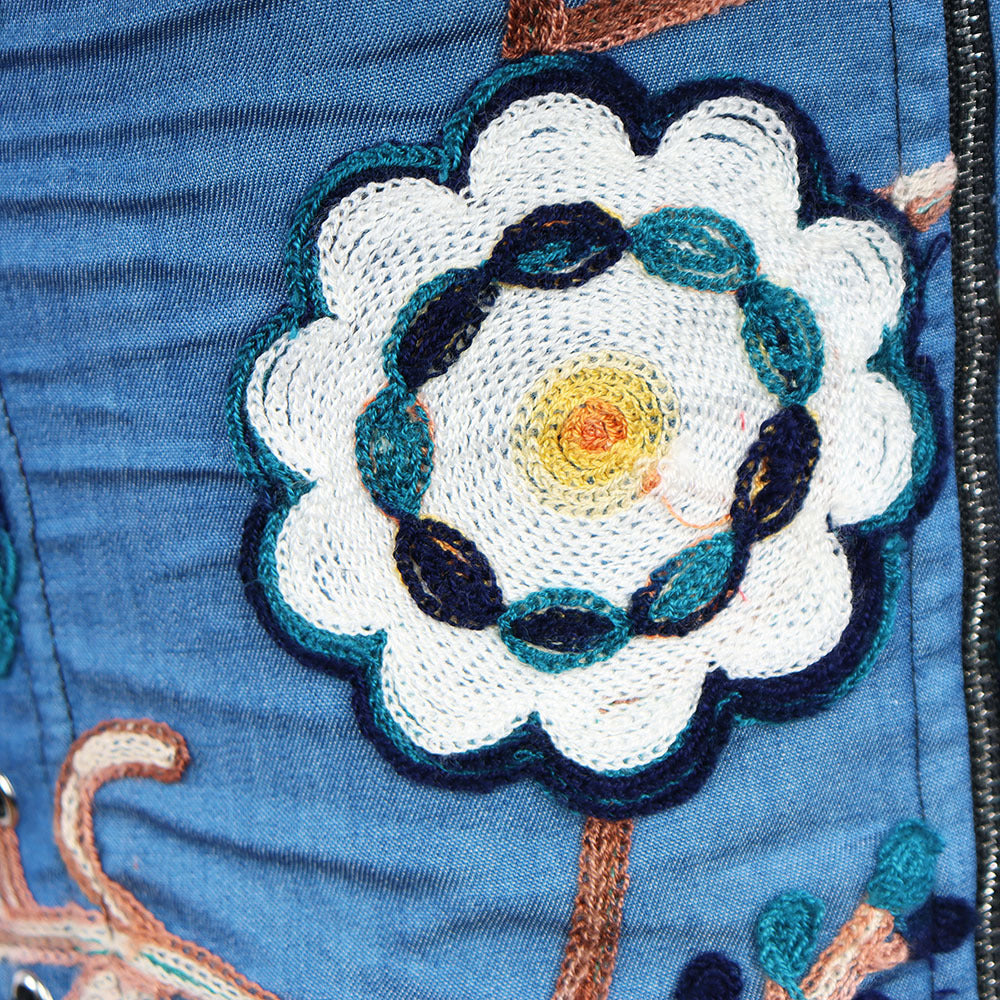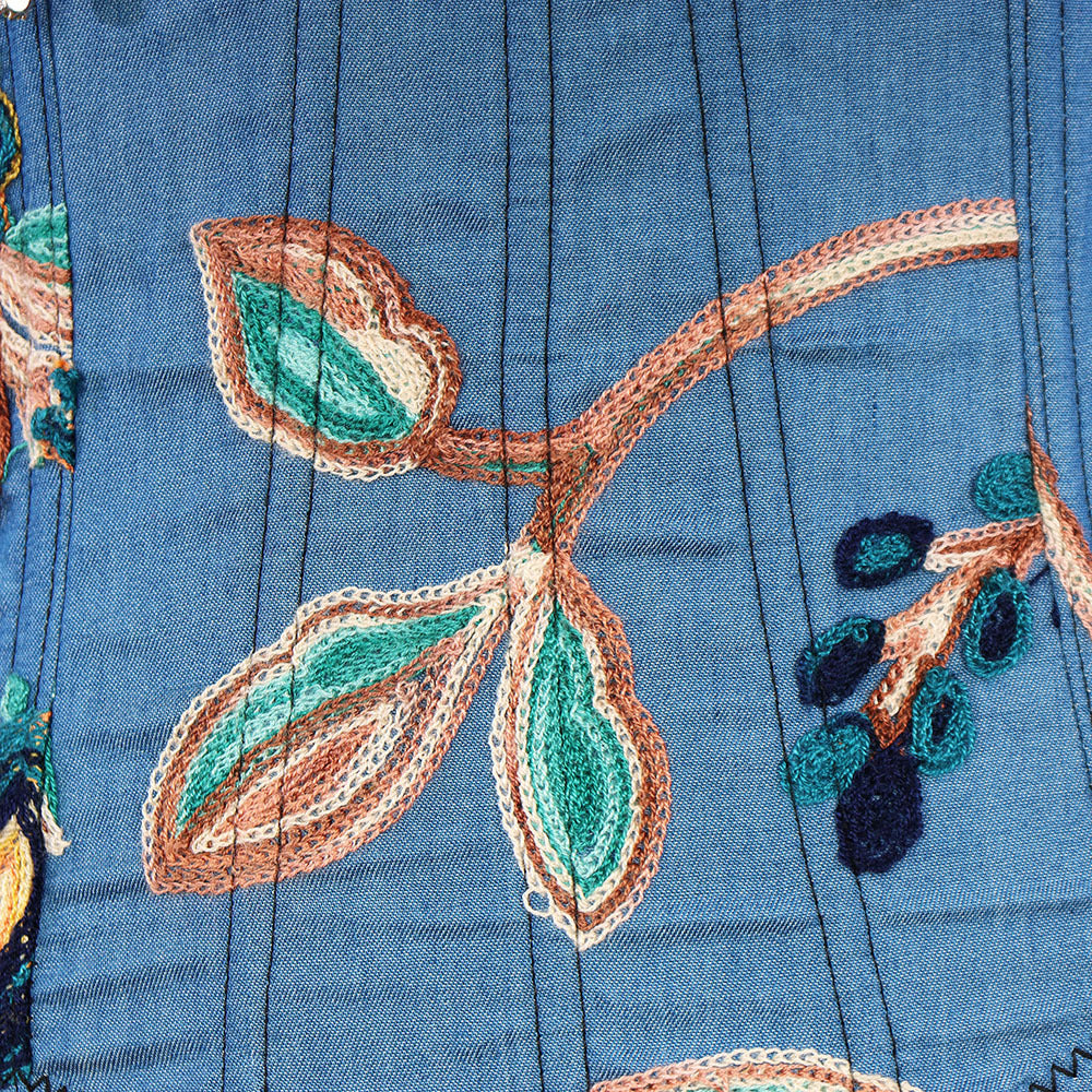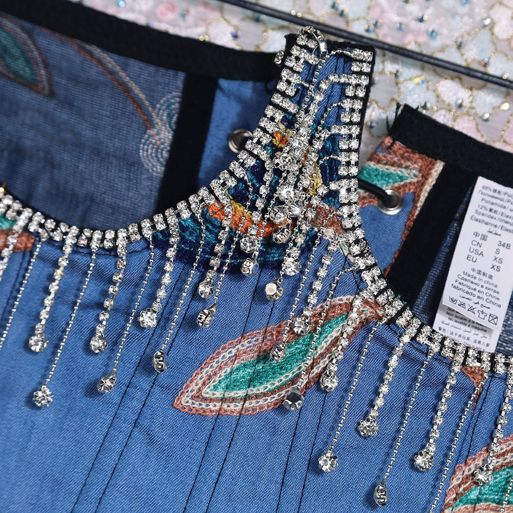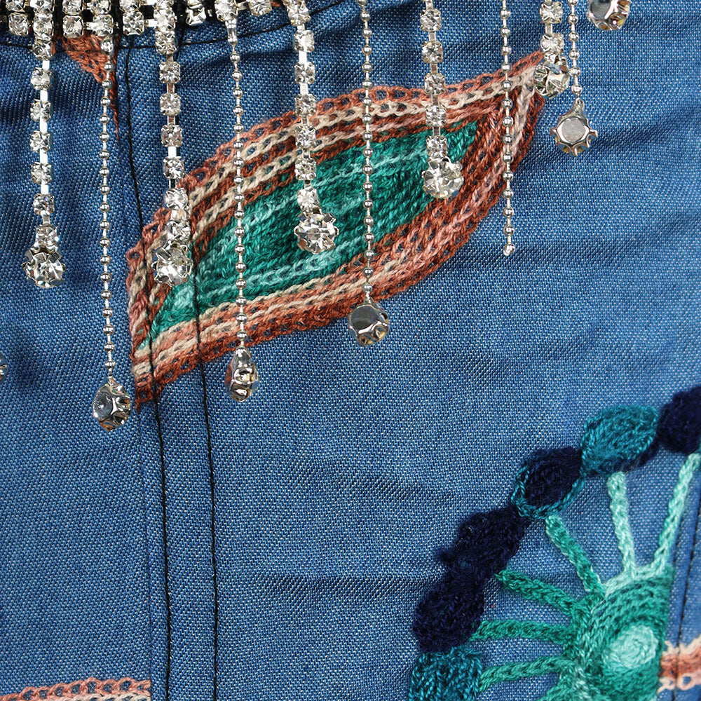 Our brand new women's corset top is a gorgeous and versatile piece. The blue cotton denim fabric is stretchy and soft, and the delicate floral embroidery is a feminine touch. The top is strapless and features a rhinestone tassel decoration on the straps.