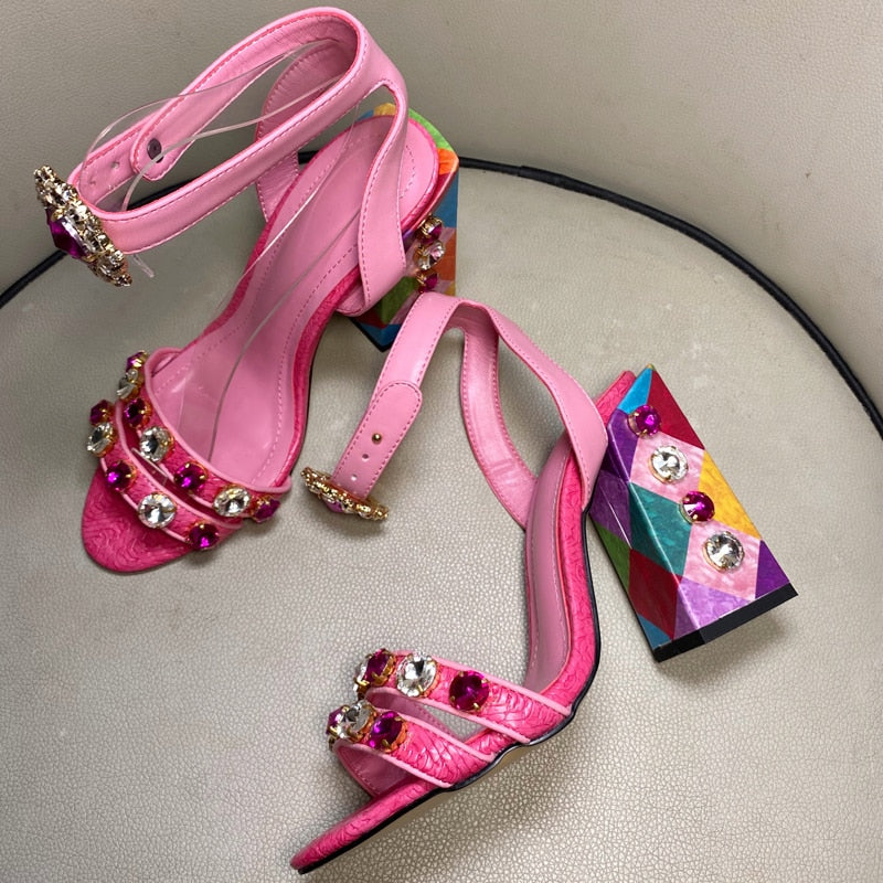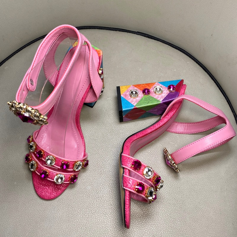 Pink Square Heel Sandal with Rhinestone Decoration, Rubber, Buckle Strap Closure, and Sheepskin Material