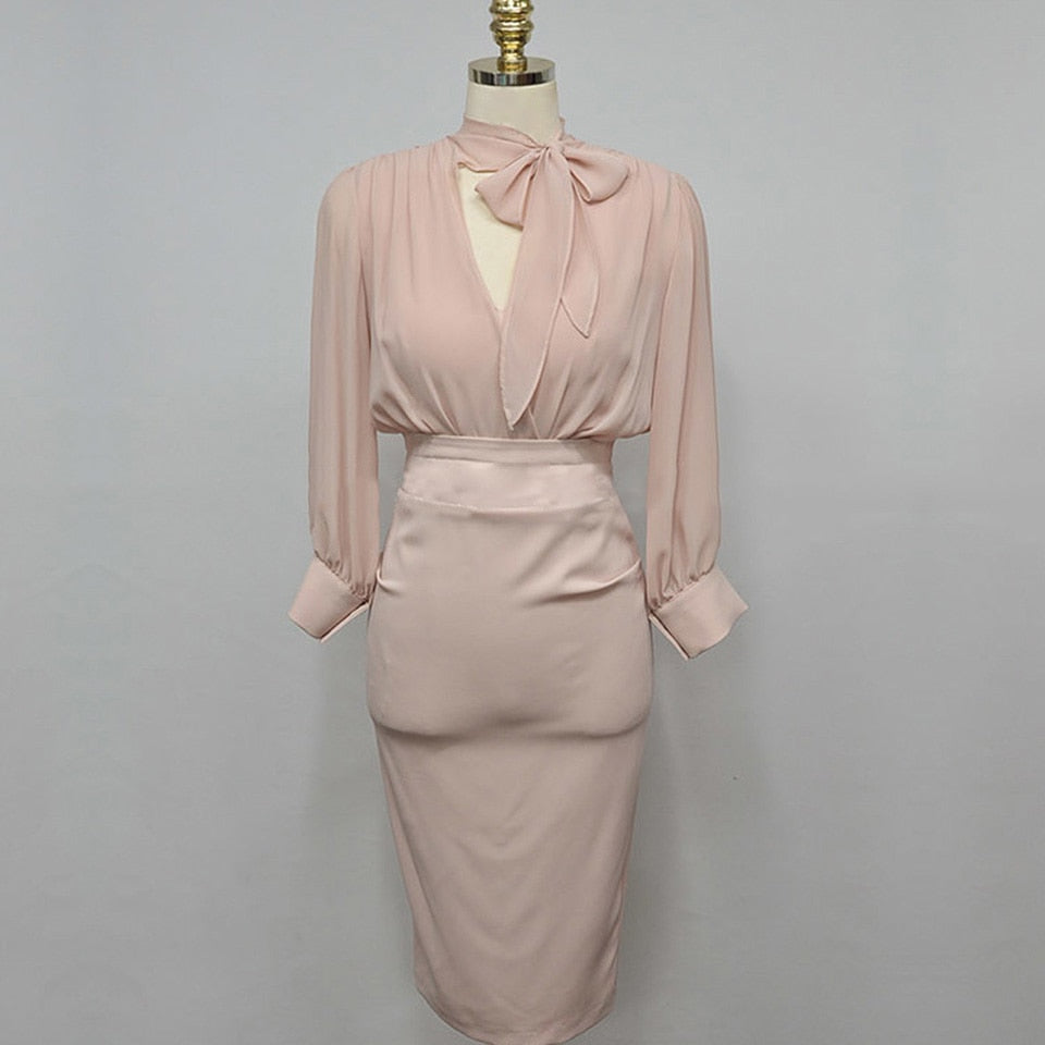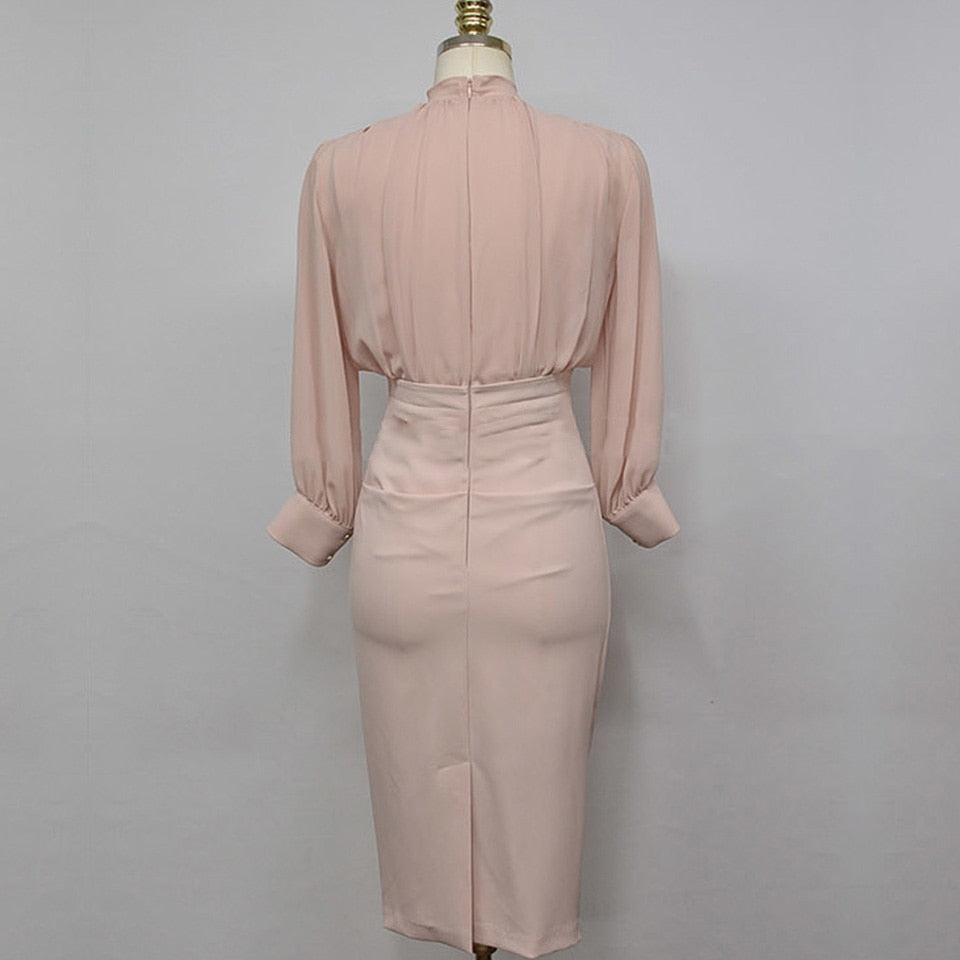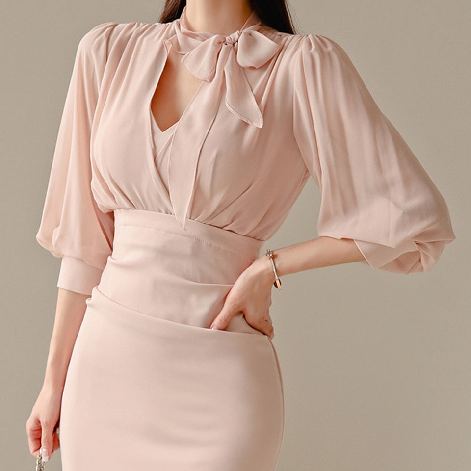 Polyester Spandex on Puff Sleeve Knee Lenght Office Lady Dress