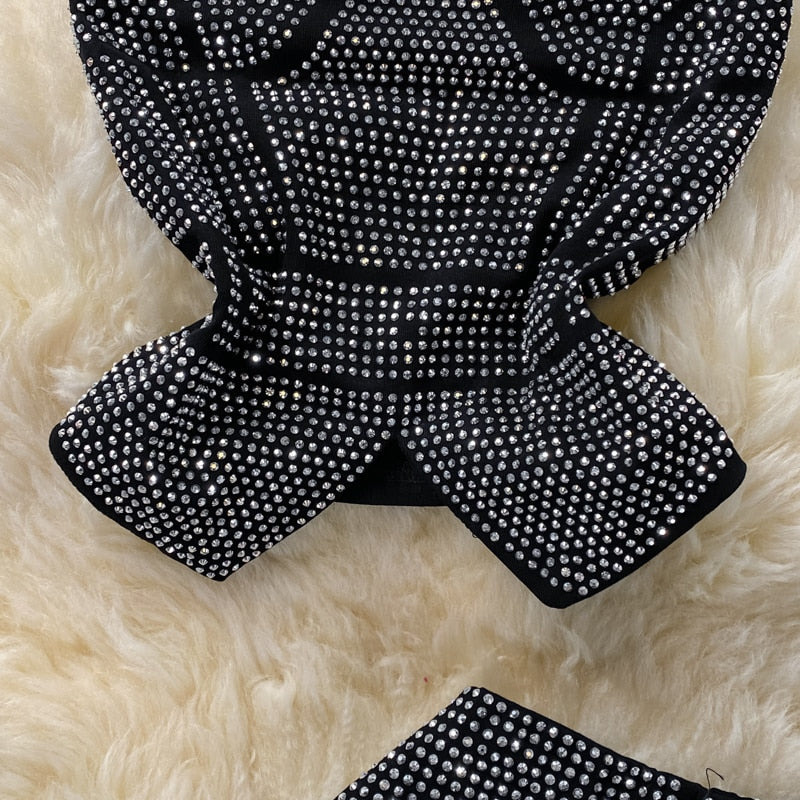 This matching set is the perfect choice for evening occasions. Decorated with rhinestone, make it look elegant. The top of this matching set has a slash neck, so you can showing off your shoulders.
