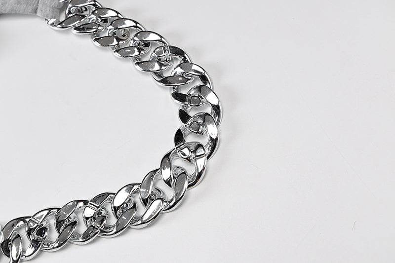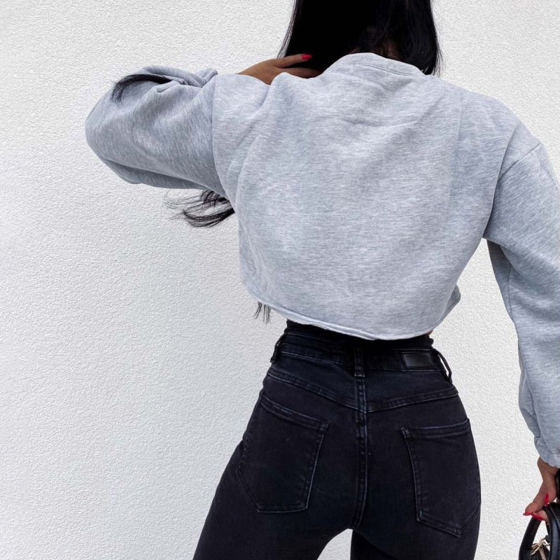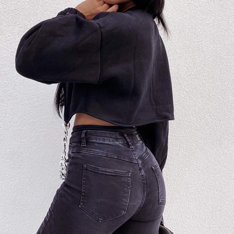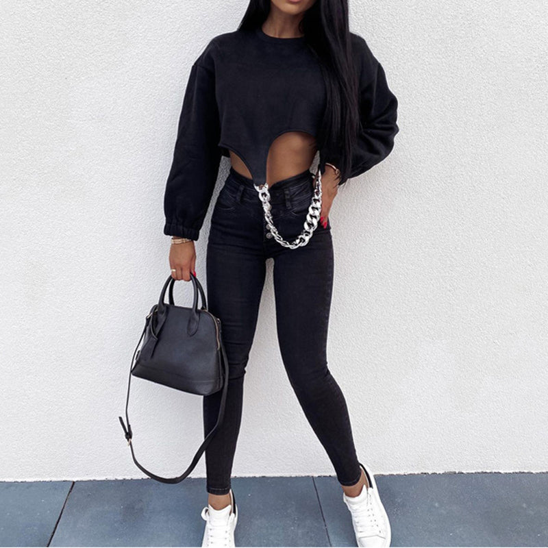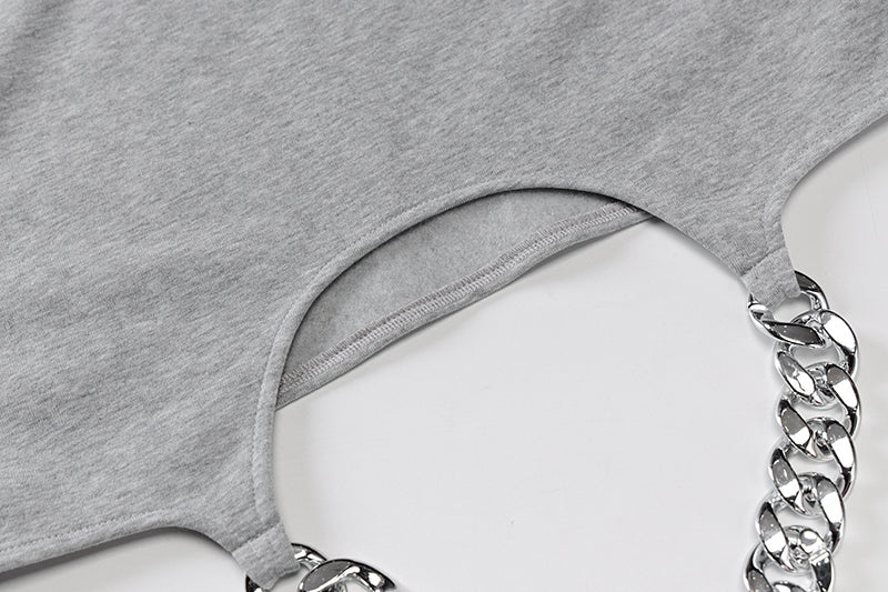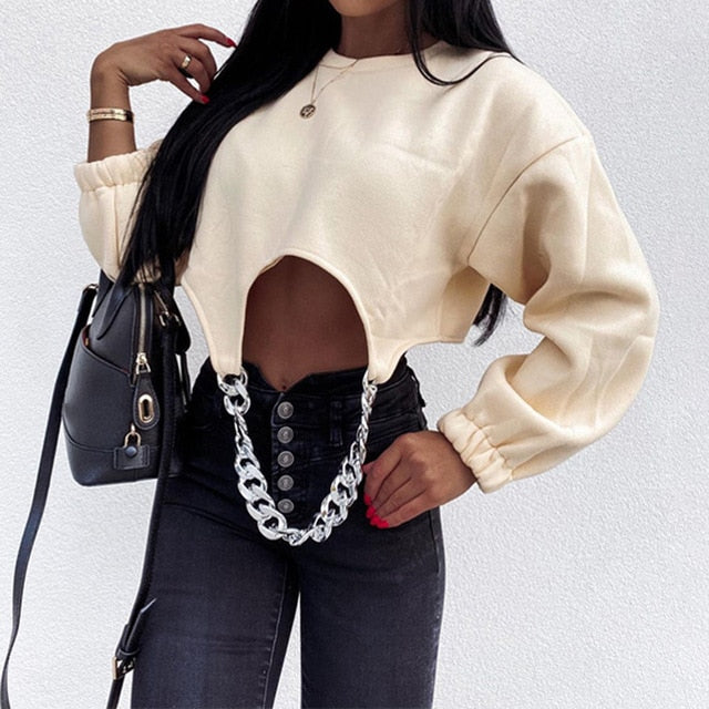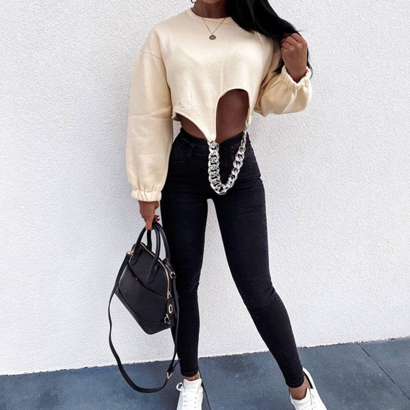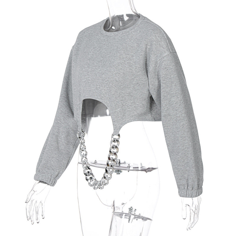 Solid Long-Sleeved Polyester Spandex Crop Top with Chain Decoration