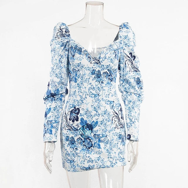 Sexy Floral V- Neck Long Sleeve Women Bodycon Mini Dress