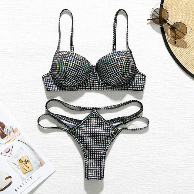 Polyester Spandex Bikini with Full Geometric Rhinestone Square Decoration