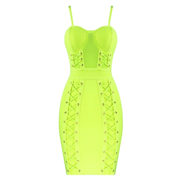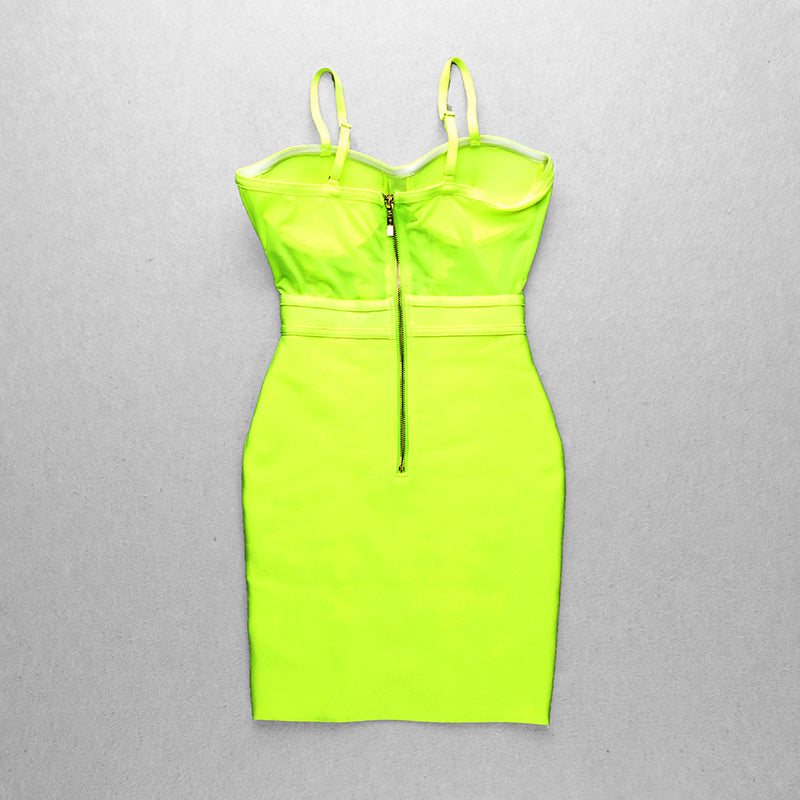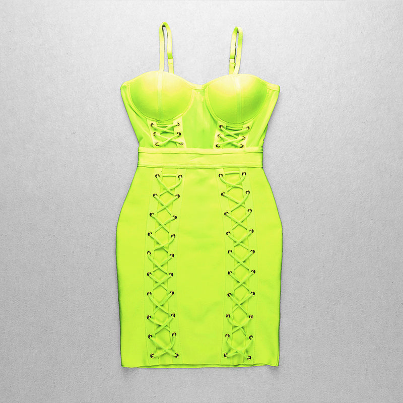 Neon Green Mini Dress with Adjustable Straps, Zipper Closure, and Cross Stitches Decoration