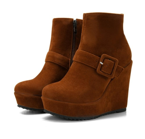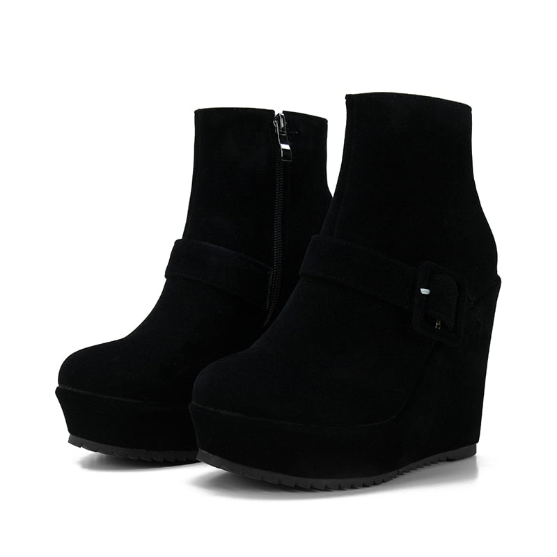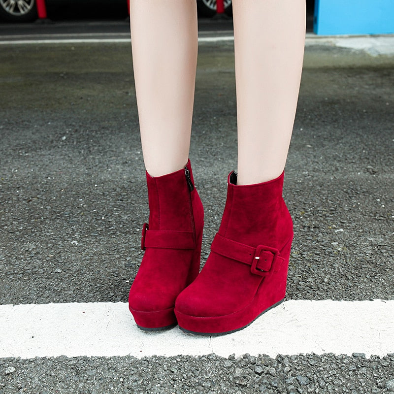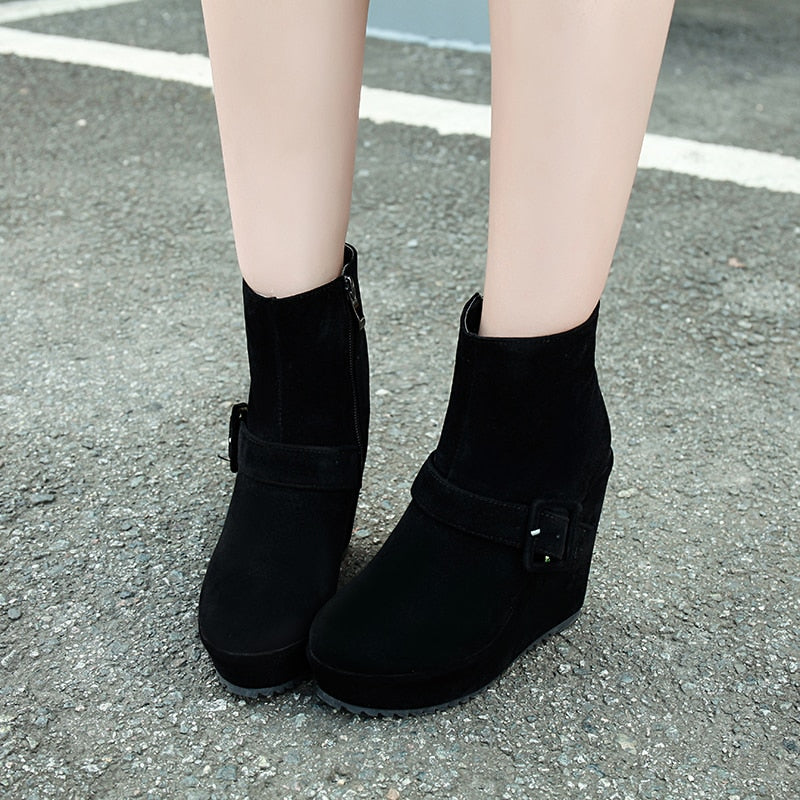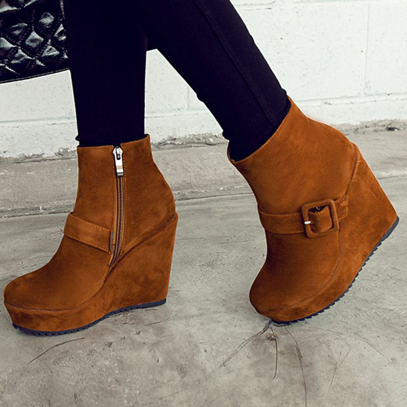 These stylish and comfortable women’s boots are perfect for casual wear and for wearing with skirts or dresses. Flock material gives these ankle boots a high-quality look and feel. The round toe provides a comfy and stylish design that will never go out of style. The wedge heel delivers an effortless way to be the center of attention.