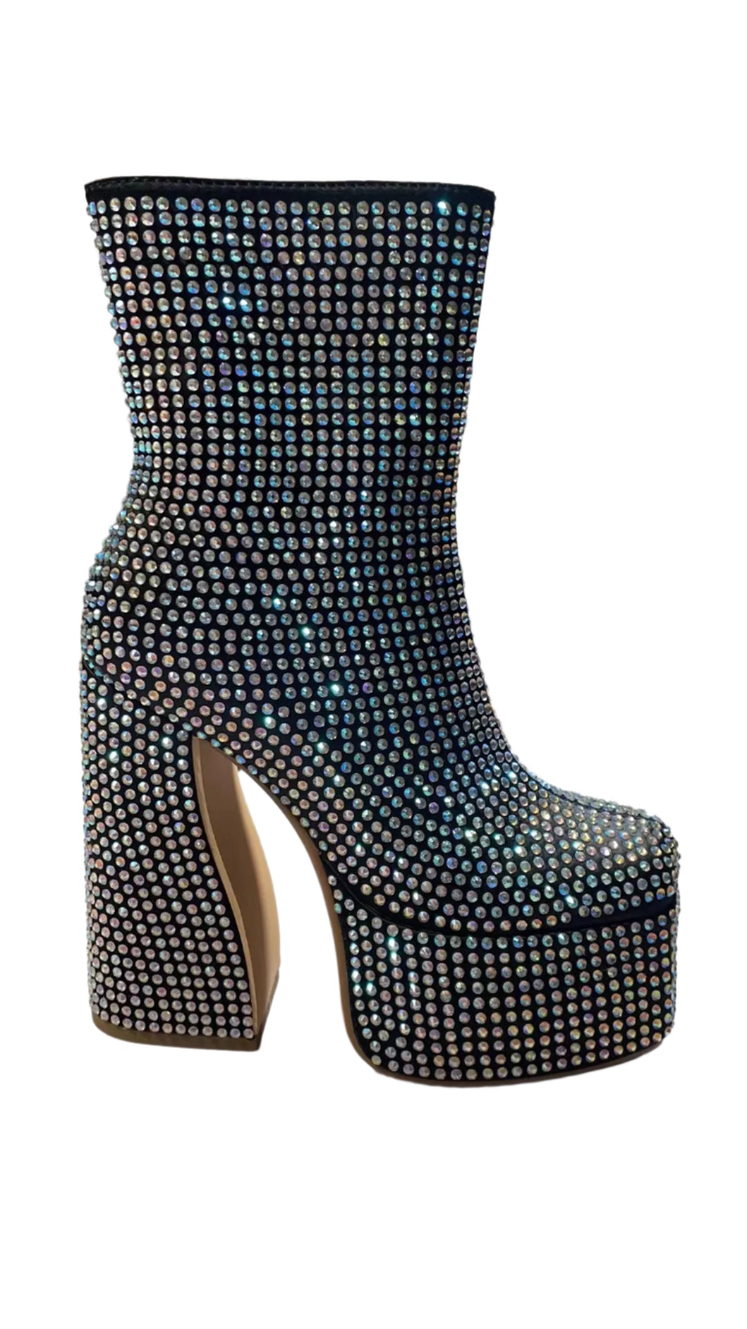 Step into the spotlight with these daring Spotlight Strike Mid-Calf Boots. Featuring sleek Chelsea boot styling and easy slip-on design, they combine effortless wear with bold rhinestone accents that catch every eye. Elevate your look with boots that command attention and exude confident flair.