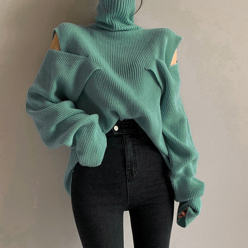 Off-Shoulder Sweater with Turtleneck Collar, Button Decoration, and Cotton Polyester Material