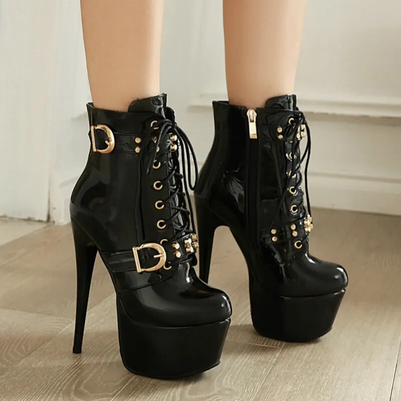 These Stolen Lullaby Boots are crafted with quality materials - patent leather for the shaft, upper, and lining, and rubber for the outsole. A thin heel and round toe provide a comfortable fit, with a heel height of 8cm and a platform height of 5-7cm. These fashionable boots have a solid pattern, a zip closure for easy on/off, and a plush insole for extra comfort.