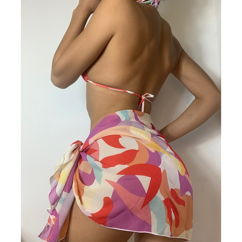 Colorful Lycra Polyester Bikini with Halter Top and Waist Wrap
