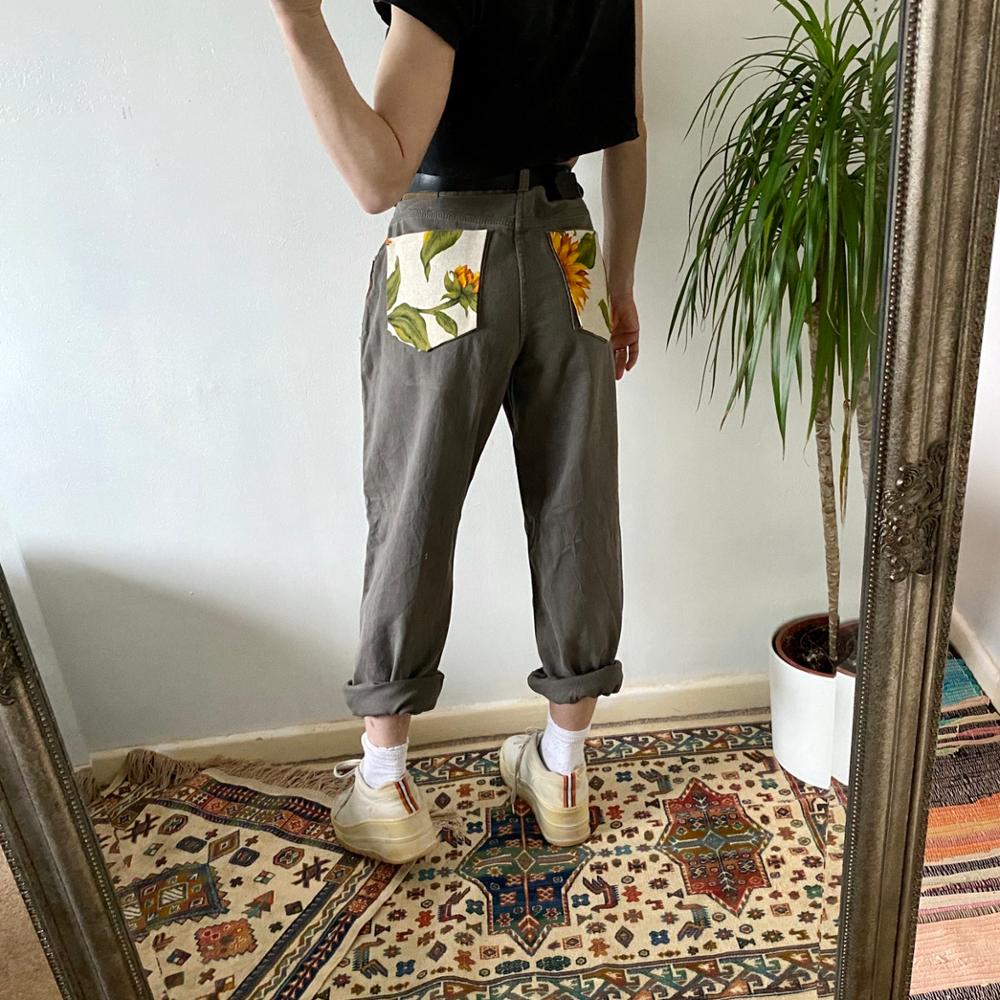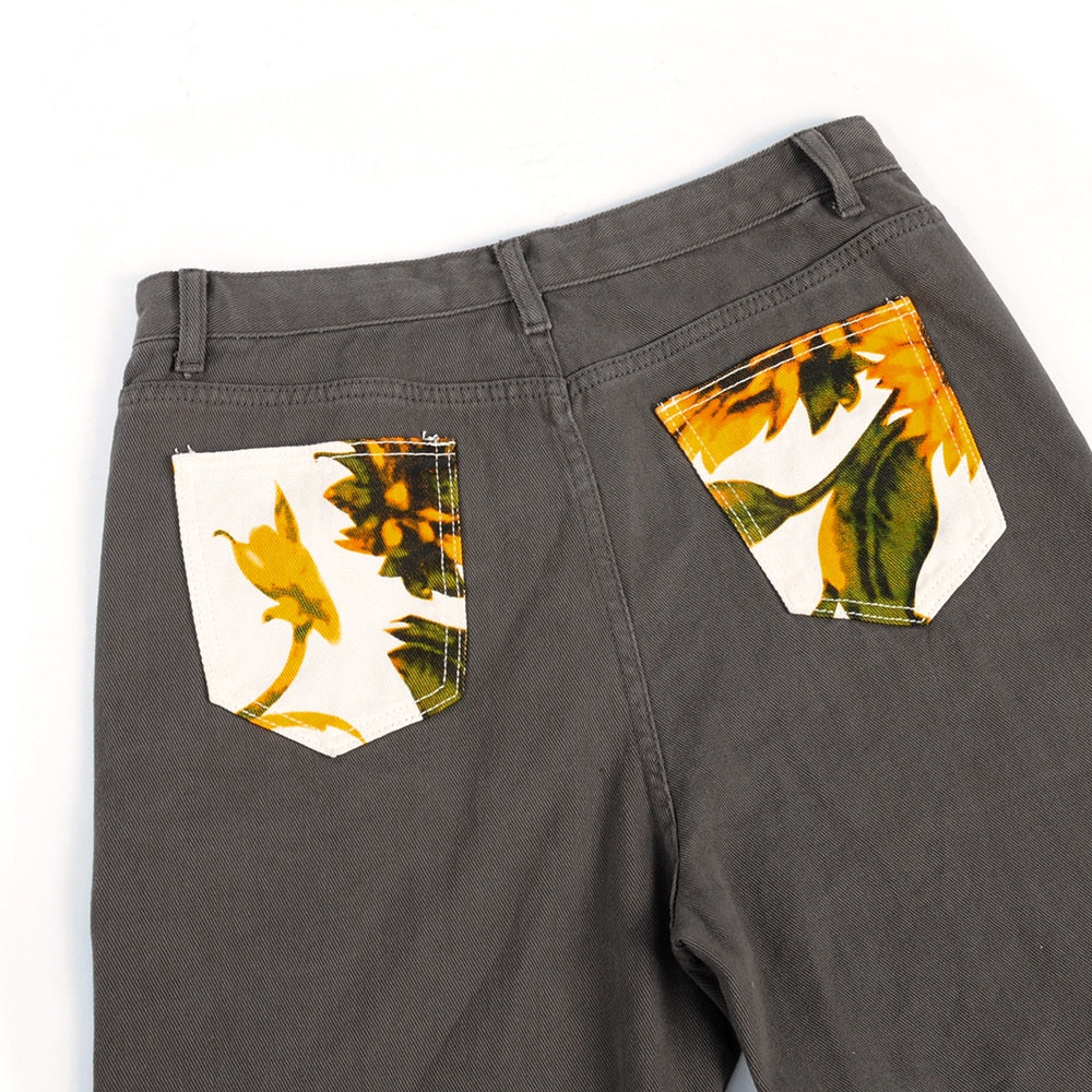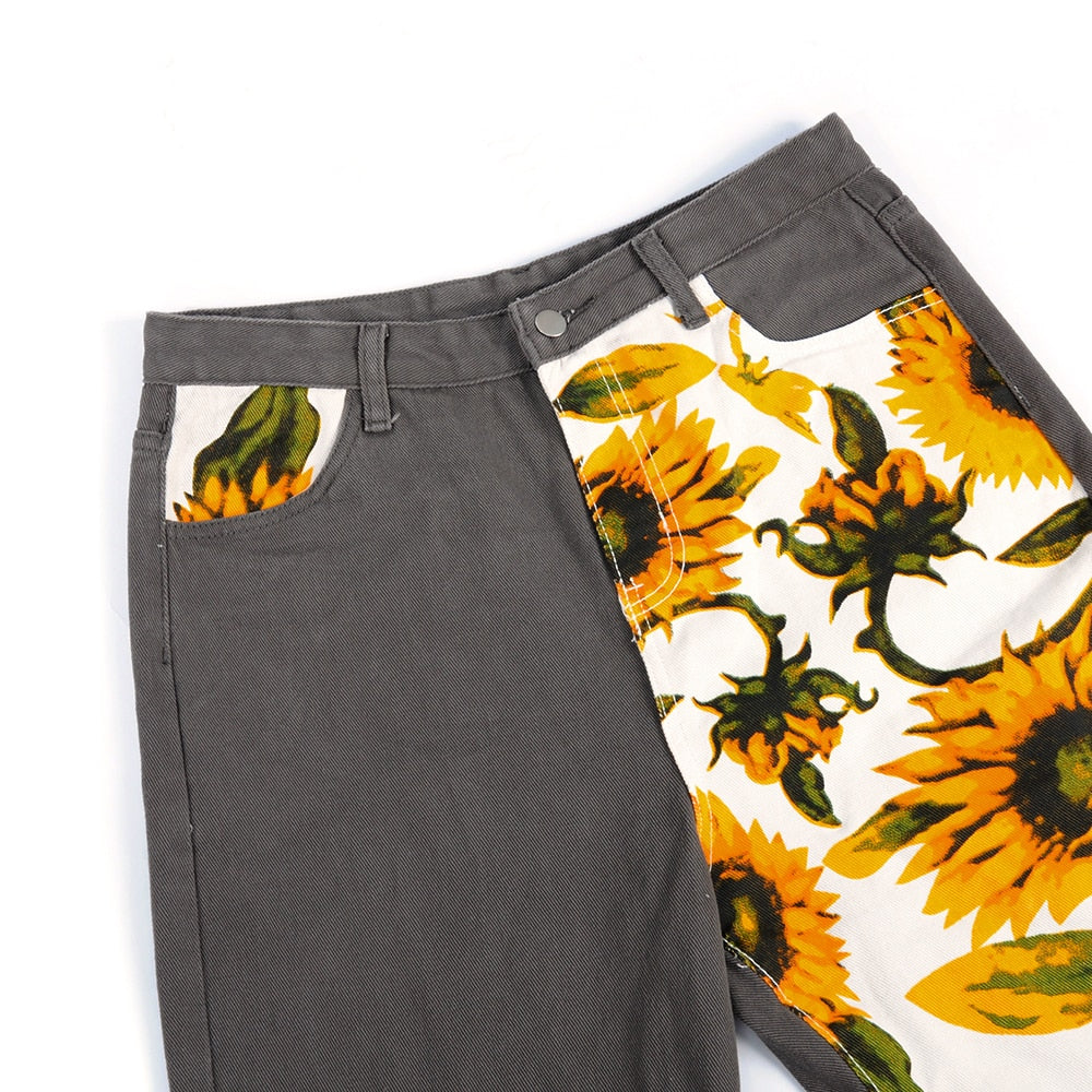 Sun Flower Printed Straight Jeans With Pocket Decoration, High-Waisted, And Cotton Polyester Material
