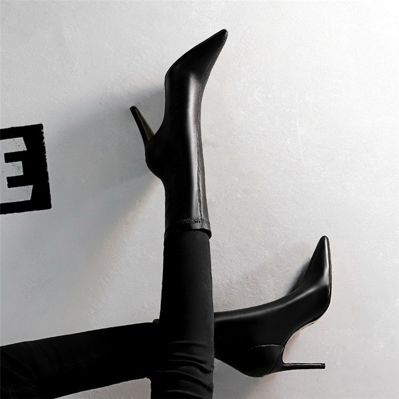 Cotton Fabric PU Leather Solid Patterned Pointed Toe Thin Heels Slip On Min-Calf Boot