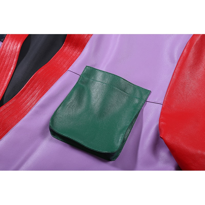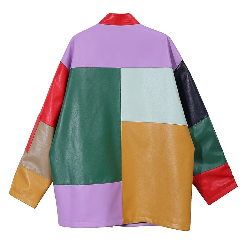 Single-Breasted Closure Jacket with Multicolor Patchwork, Pocket Decoration, Cotton, and PU Material