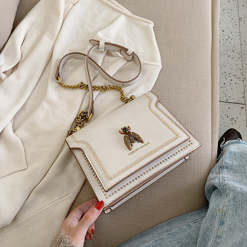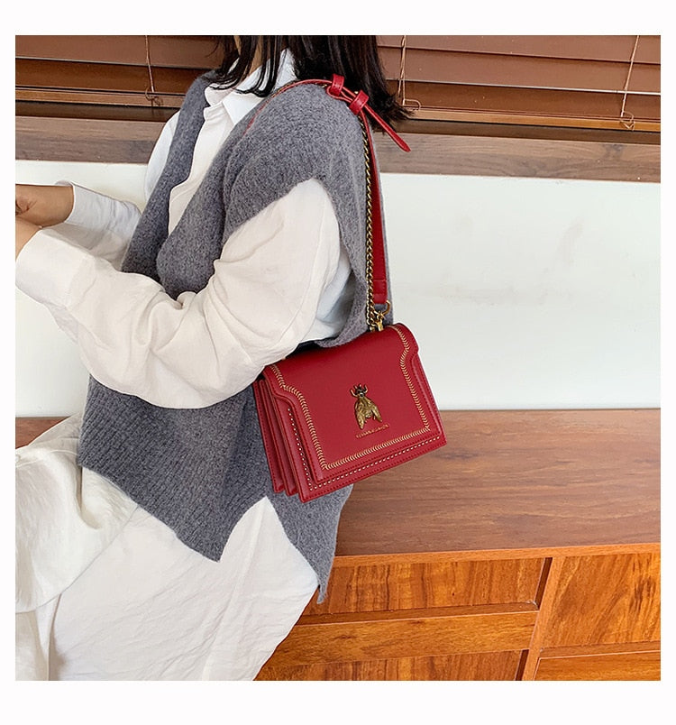 The classy yet sophisticated style of this sling bag will help you look effortless. The lovely animal rivet adds a touch of class to this accessory. The durable leather material is a great choice for a practical yet stylish bag. Fashioned in a feminine design, the chain straps add a touch of style to this bag.