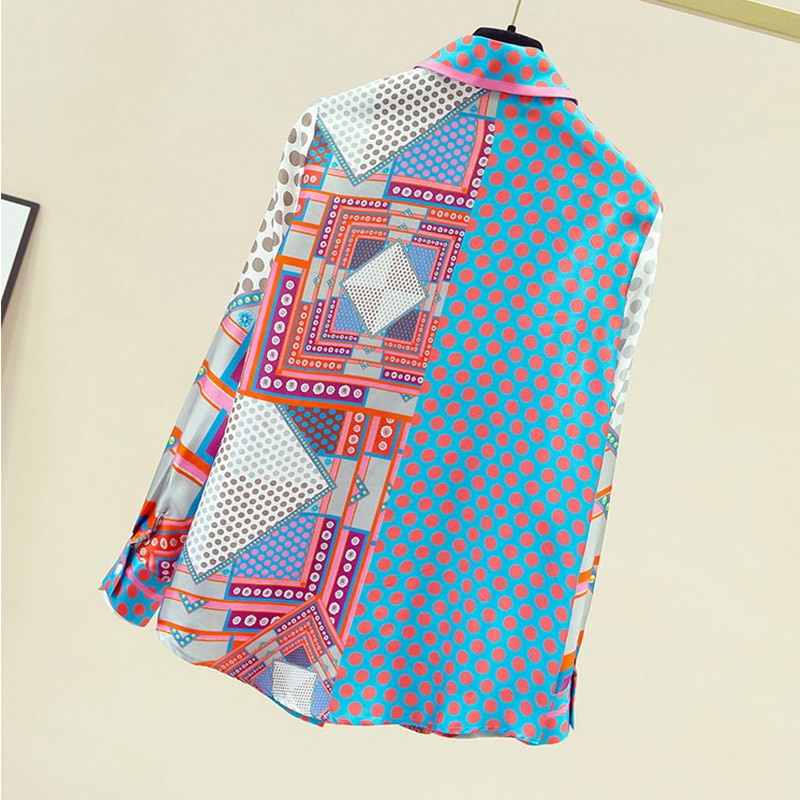 Long-Sleeved Polyester Silk Shirt with Colorful Geometric Patchwork Style