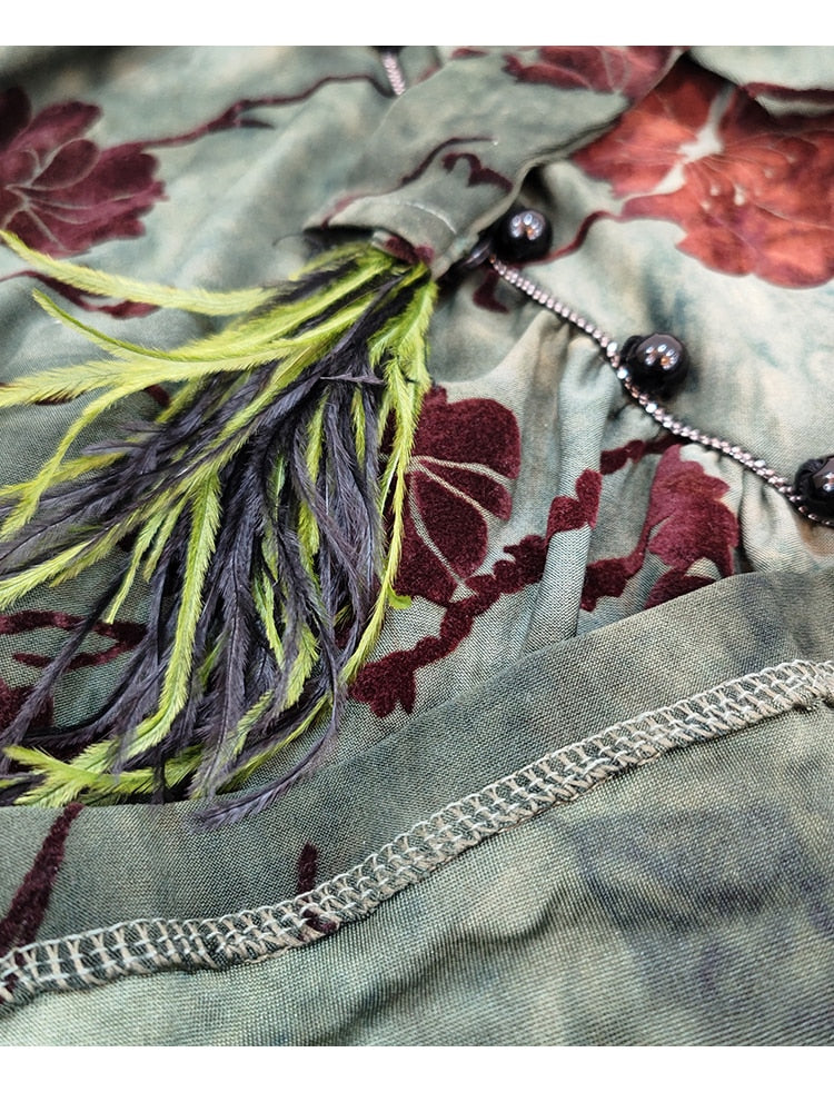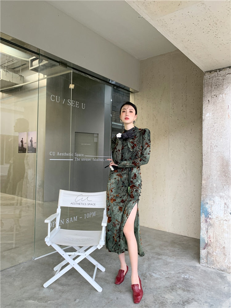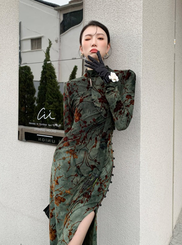 Dress up your everyday look with this grey vintage velvet midi dress. It features a high neckline and long sleeves. The skirt has a side slit and a floral vine pattern. Pair with your favorite heels and a simple clutch for a classy and elegant ensemble.