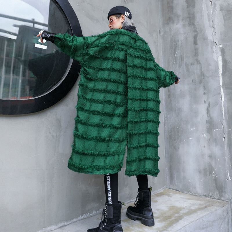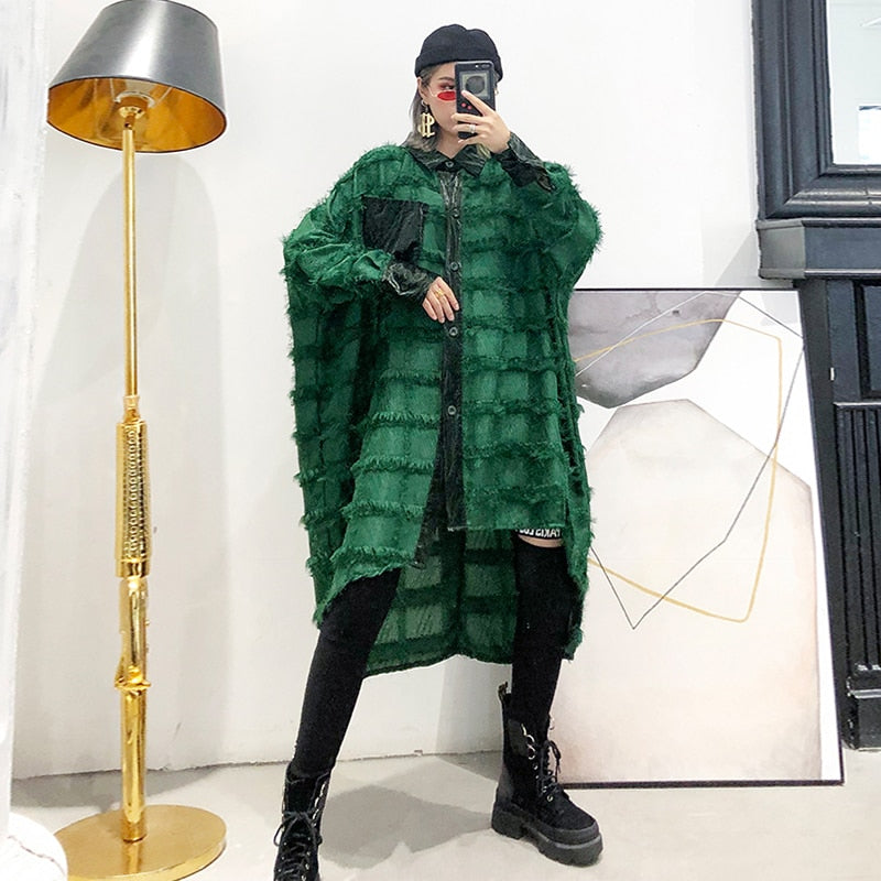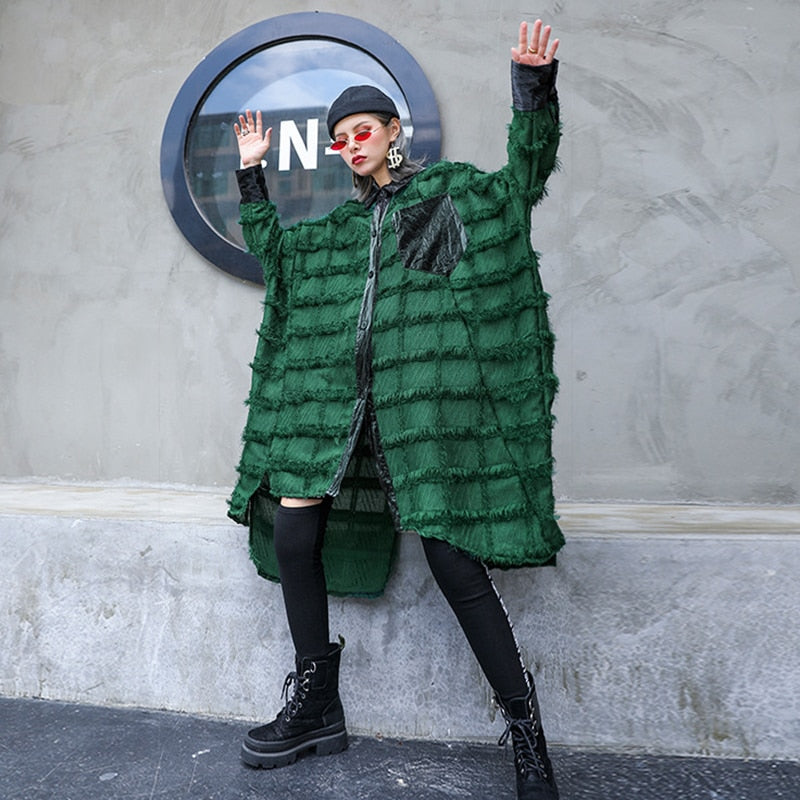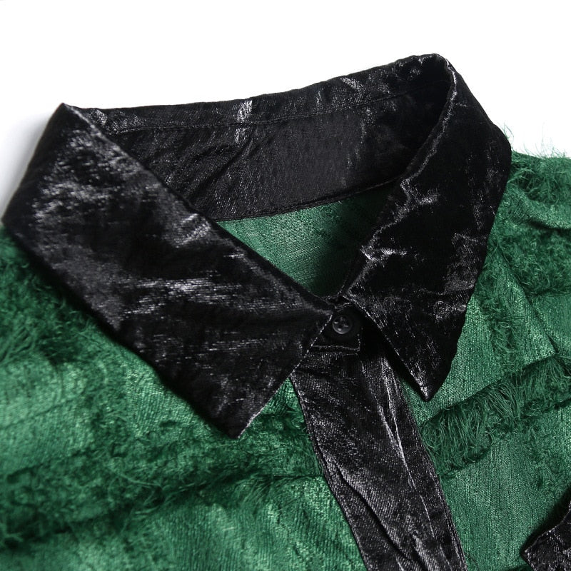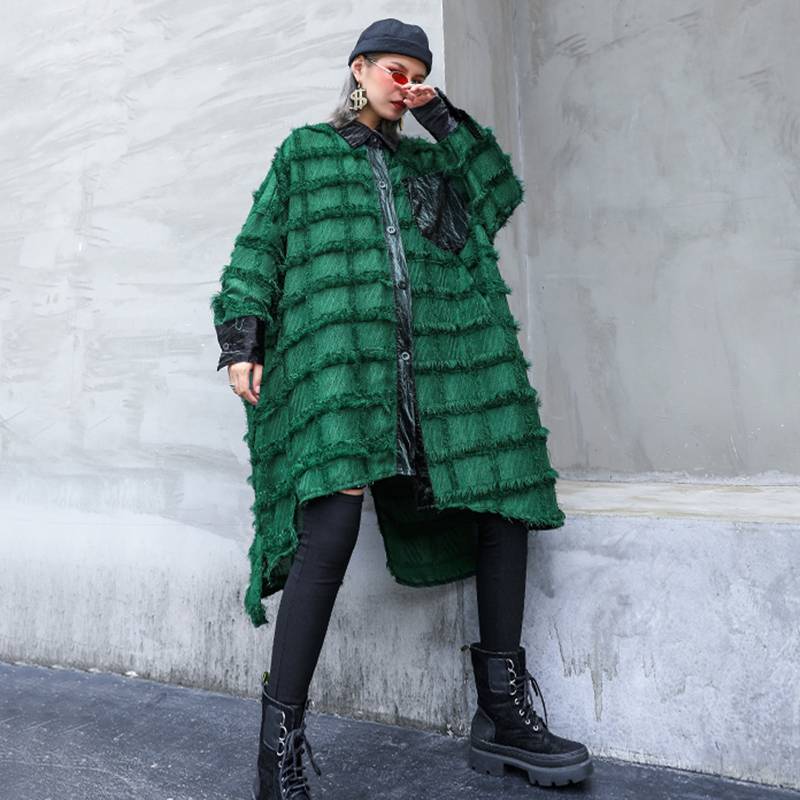 Asymmetric Green Coat With Turn-Down Collar, Patchwork Pattern, Pocket Decoration, And Cotton Polyester Material