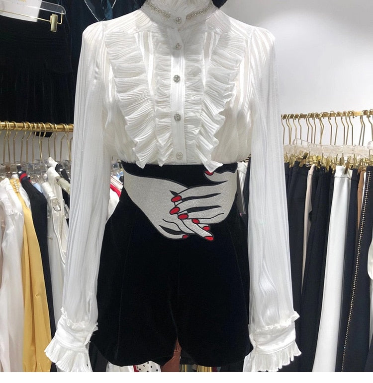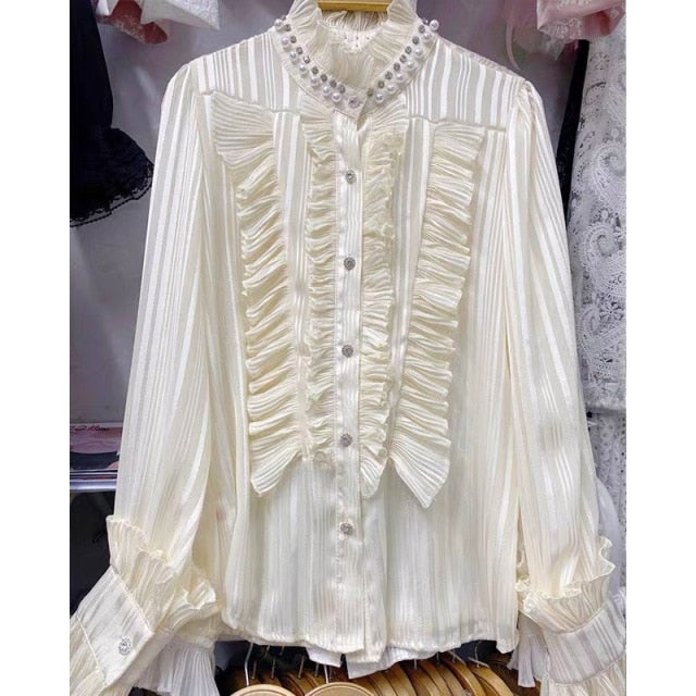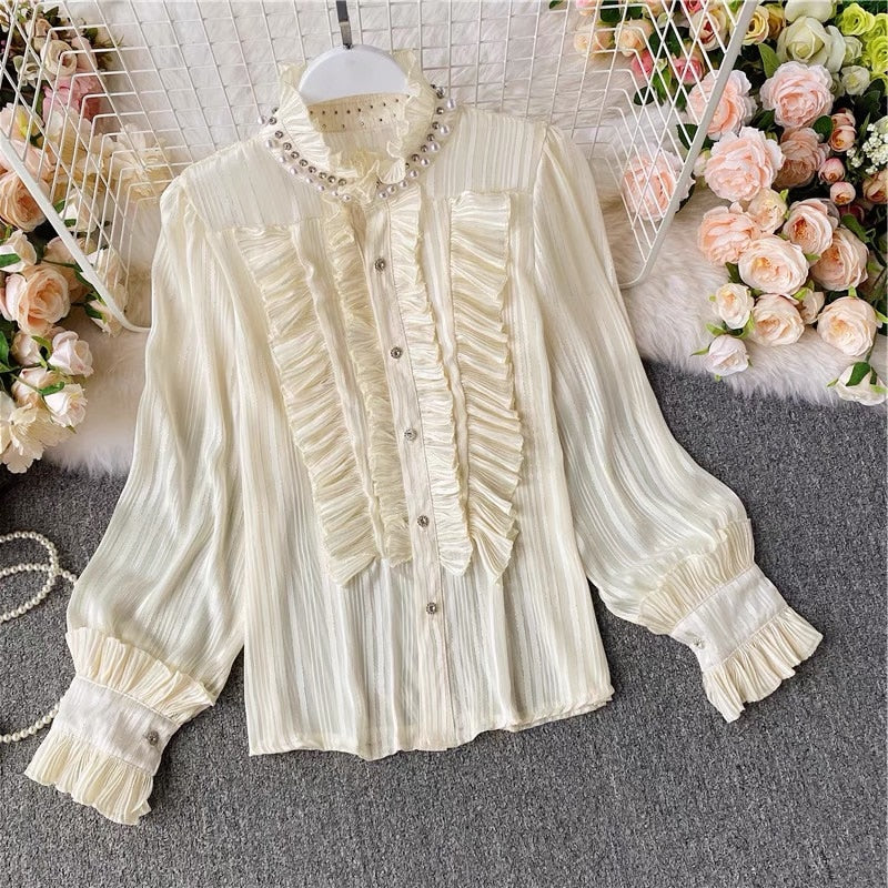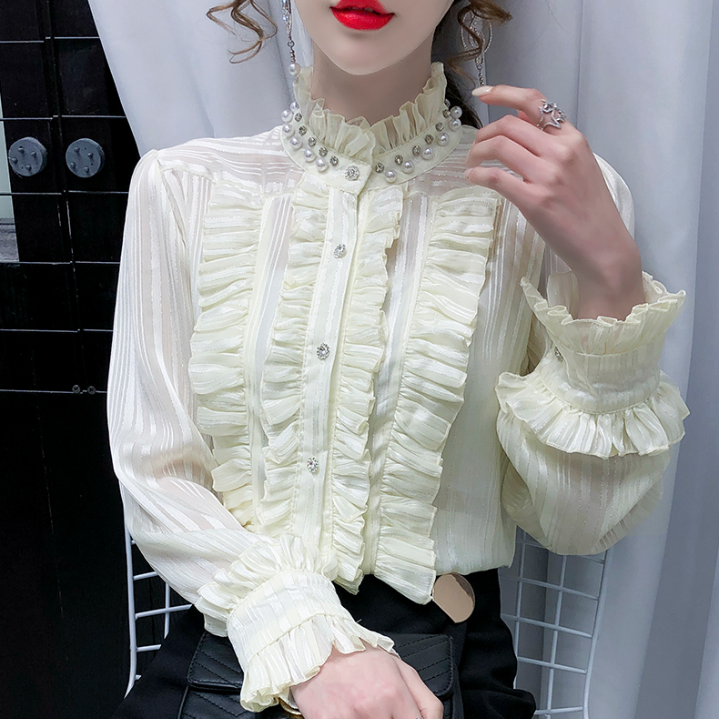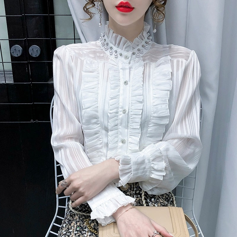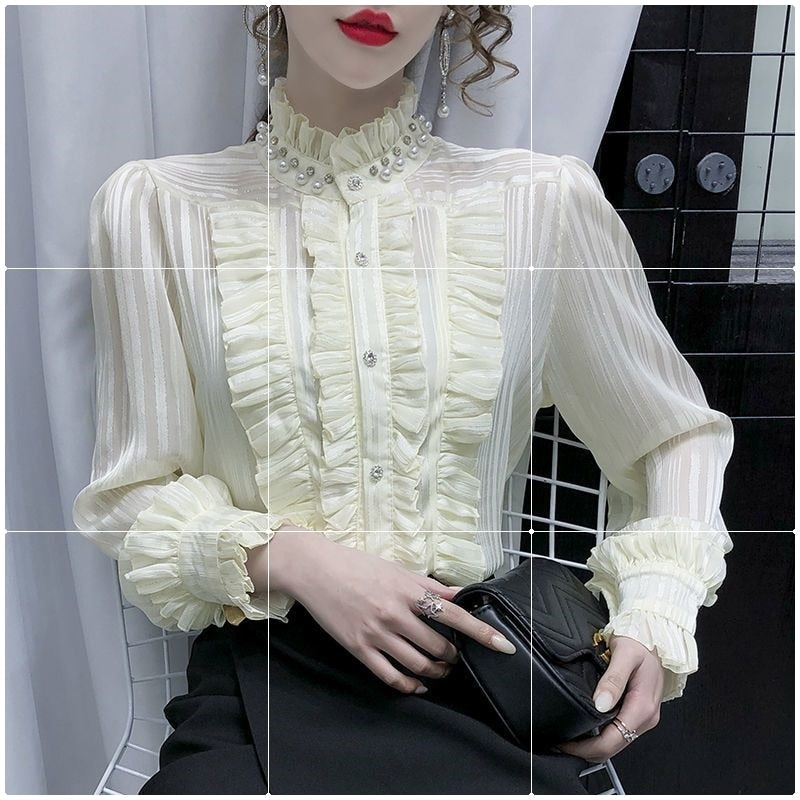 Dress up without many layers with this blouse. The ruffles are a long-lasting style. The pearly turtleneck design adds a touch of glamour to your look. The soft pastel colors also bring the spring season early. A perfect top to welcome the new season.