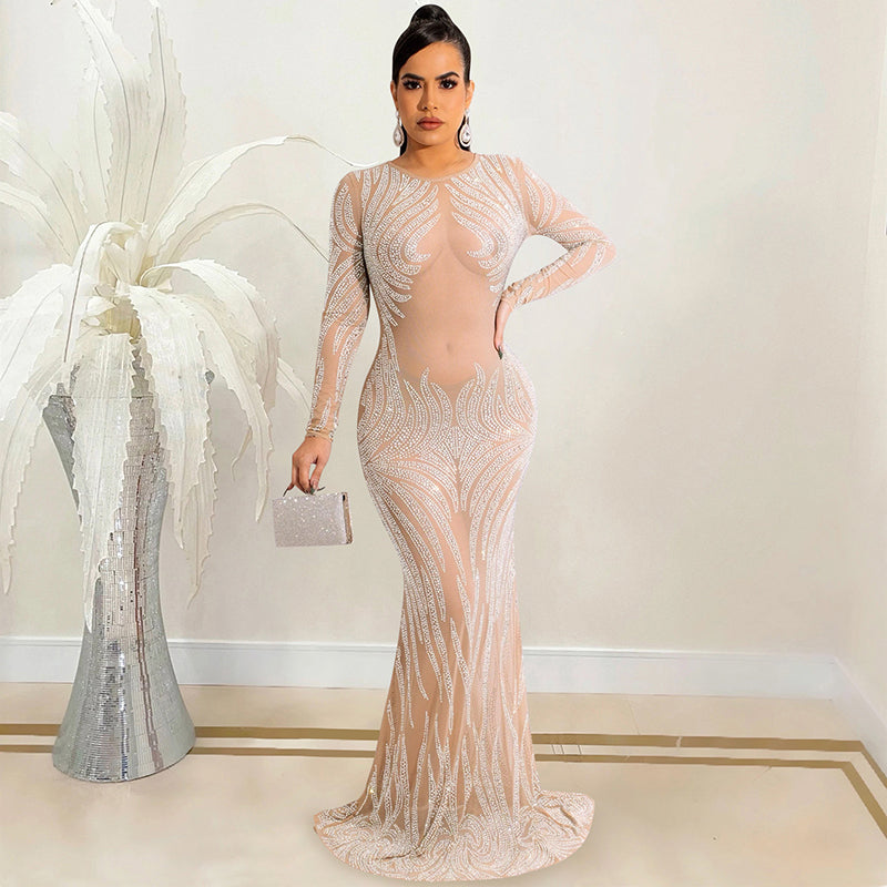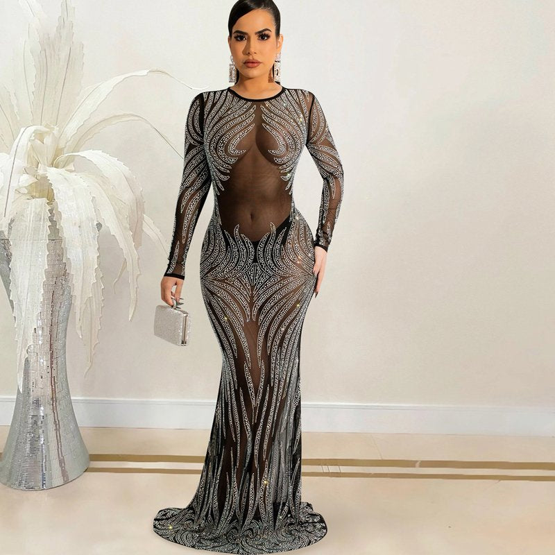 You are a glamourous woman, and this dress is made for you. You'll have a night of dancing, feeling like you're floating on air in this long mesh polyester dress that's so sparkly it'll make you feel like a queen! This floor-length dress has long sleeves to keep you warm, but with an open back, so you can show off your perfect posture.