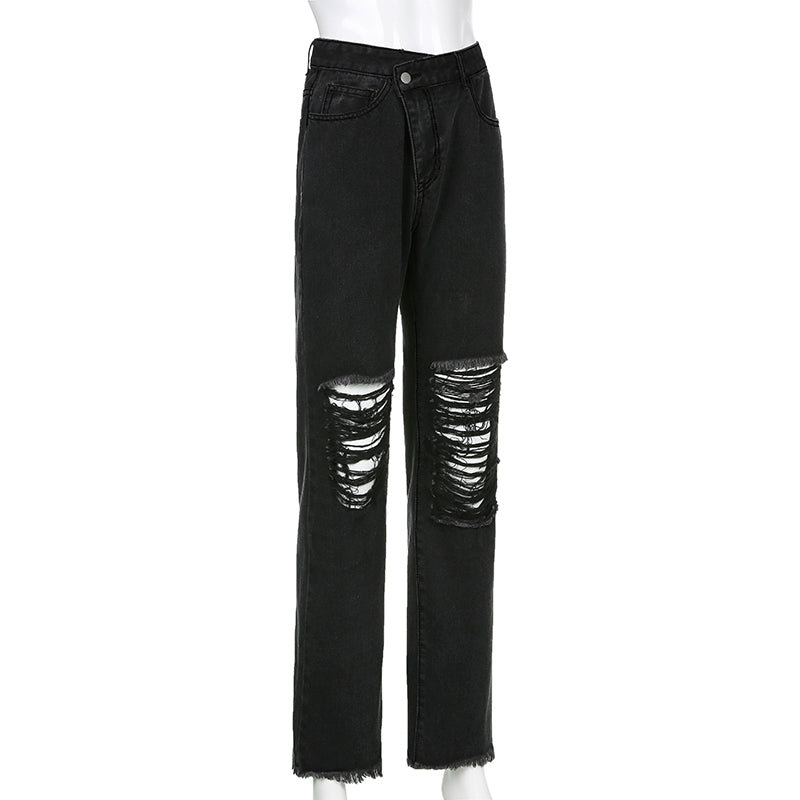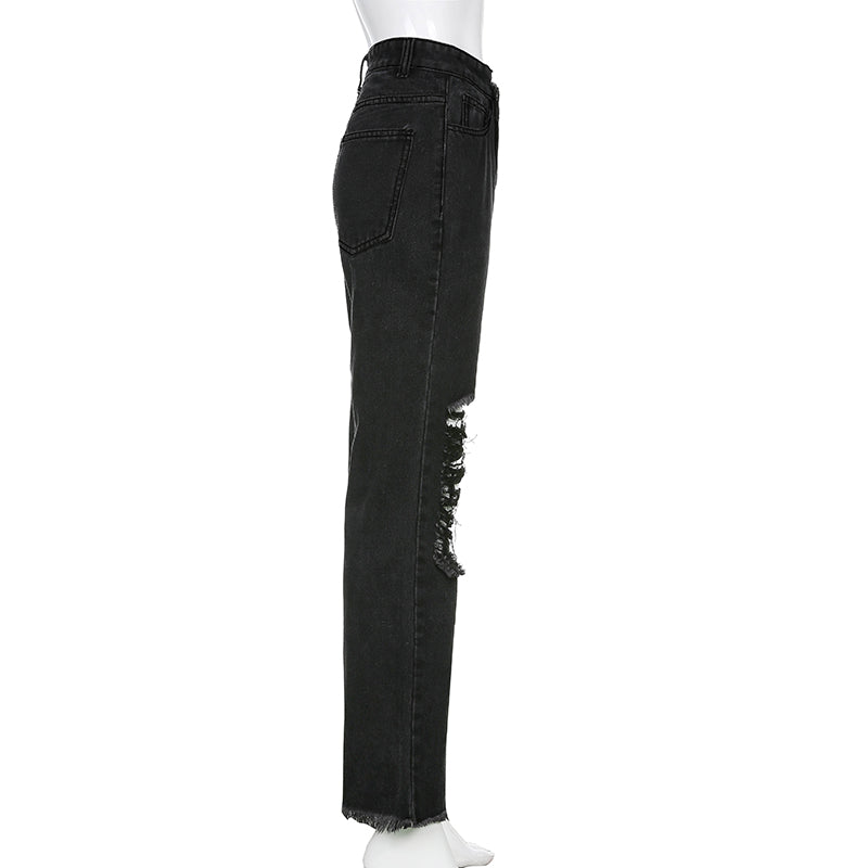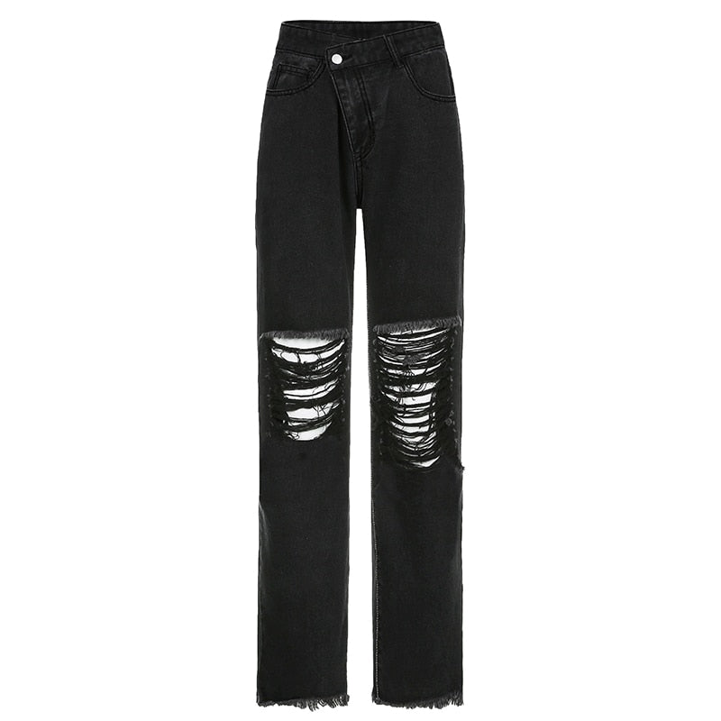 Light Washed Cotton Polyester Straight Ripped Jeans with High Waist