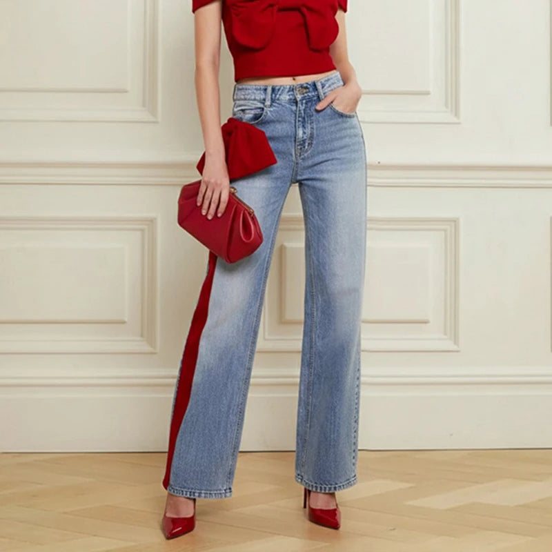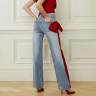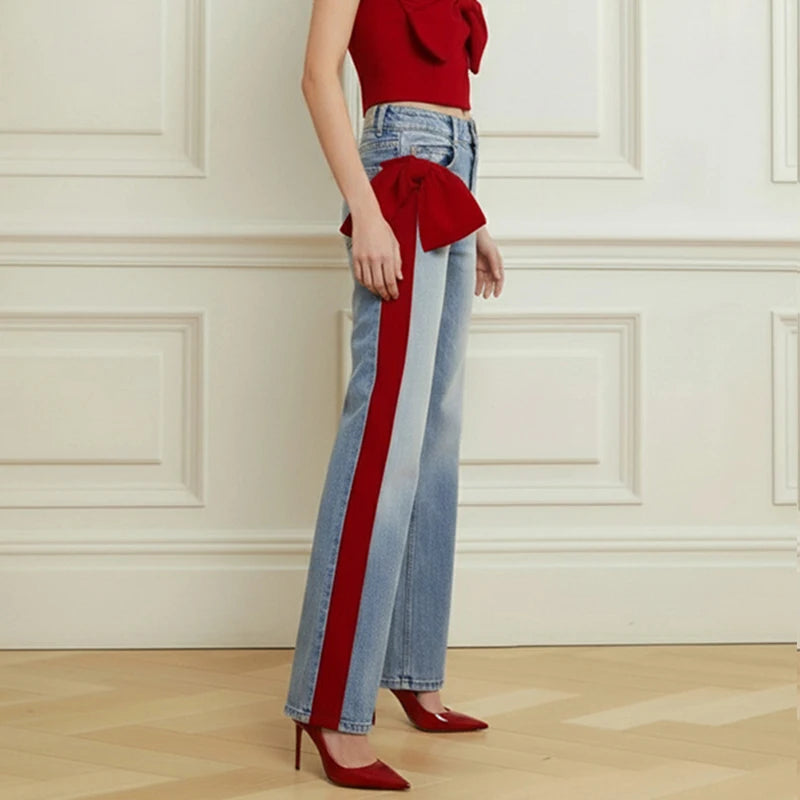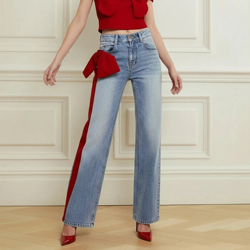 After Love's Fall Jeans Rock classic denim with a rebellious twist in these jeans adorned with a striking red bow detail. The bold crimson accent transforms an everyday staple into a statement piece that refuses to fade into the background. Perfect for those who wear their emotions on their sleeve—literally.