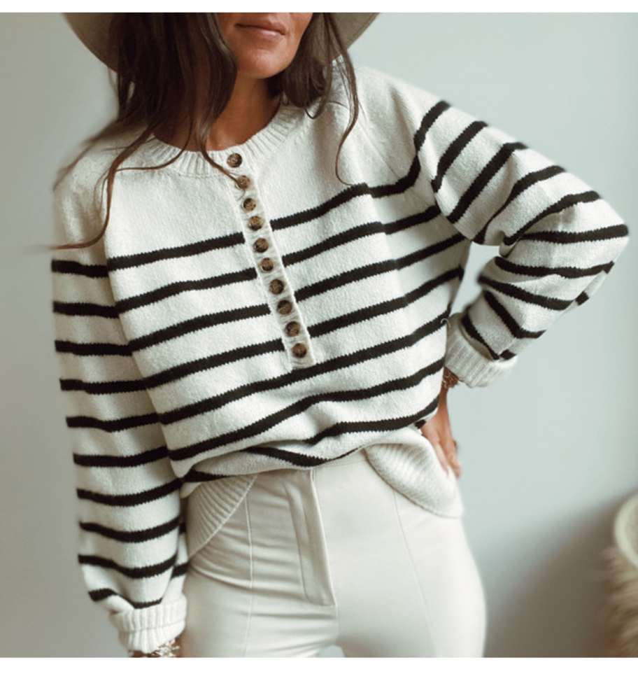 Keep cozy and stylish this fall and winter with one of this fashionable sweaters. The stylish and functional button closure and stripe pattern is a nice and unique detail that extends the style and functionality of the sweater. The lightweight and breathable materials make it a practical piece that you'll always feel good when wearing.