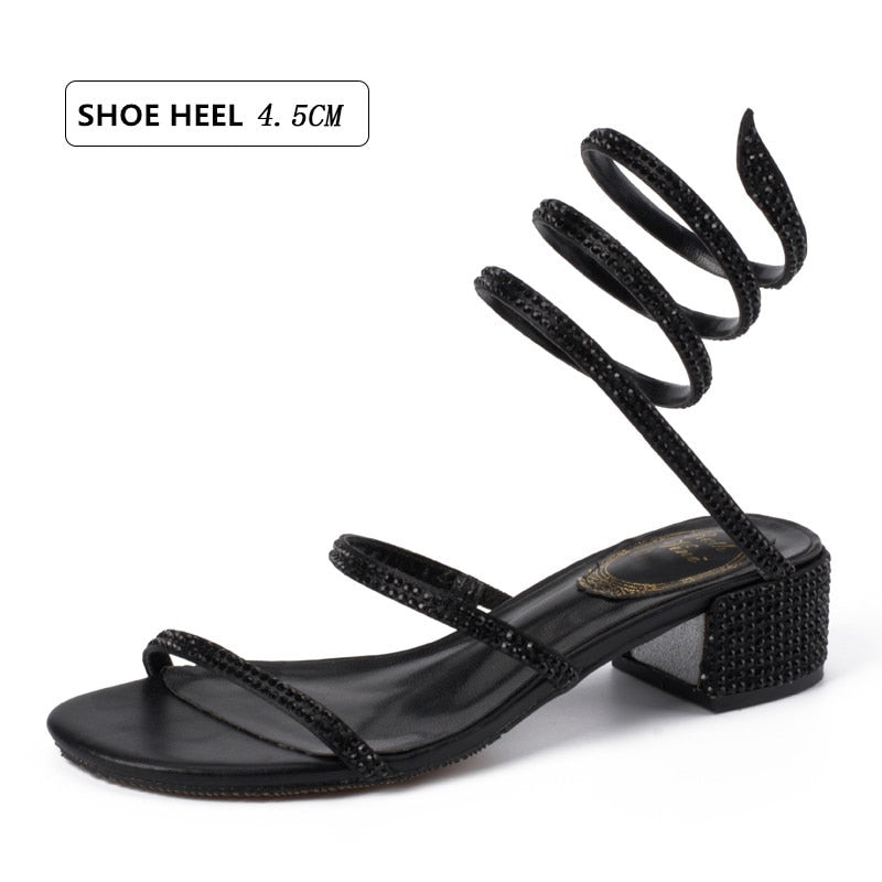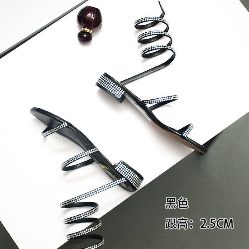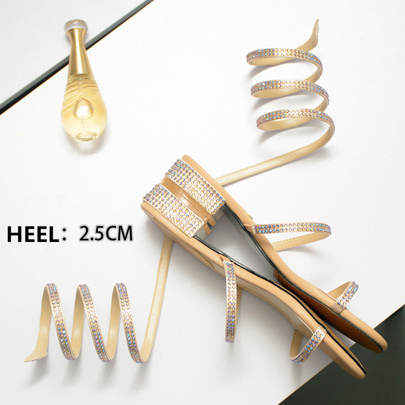 Rhinestone Decorated Silk Low Heeled Sandal with Spiral Mid-Calf Wrap