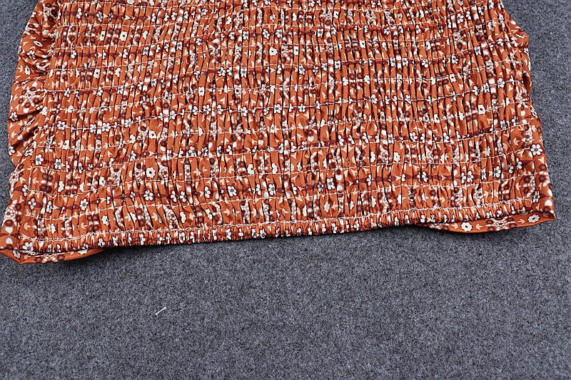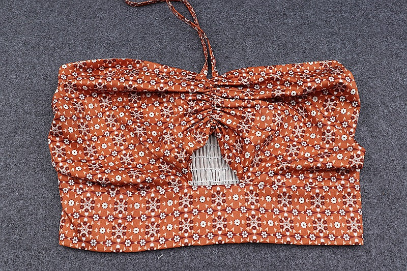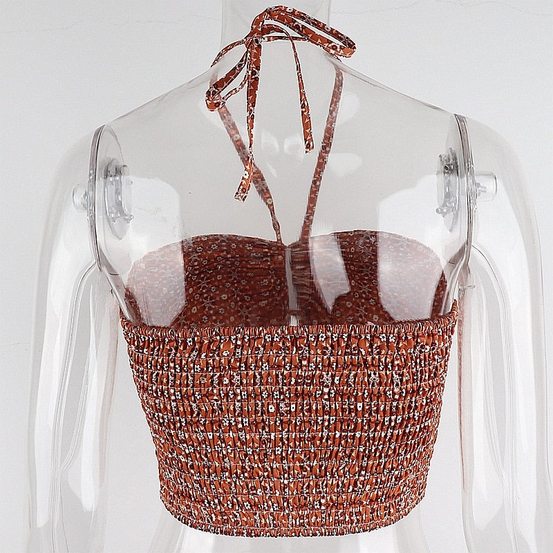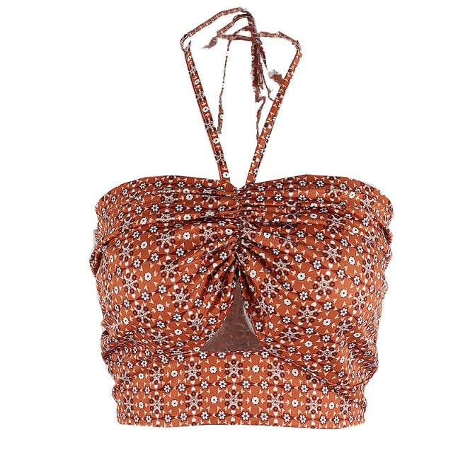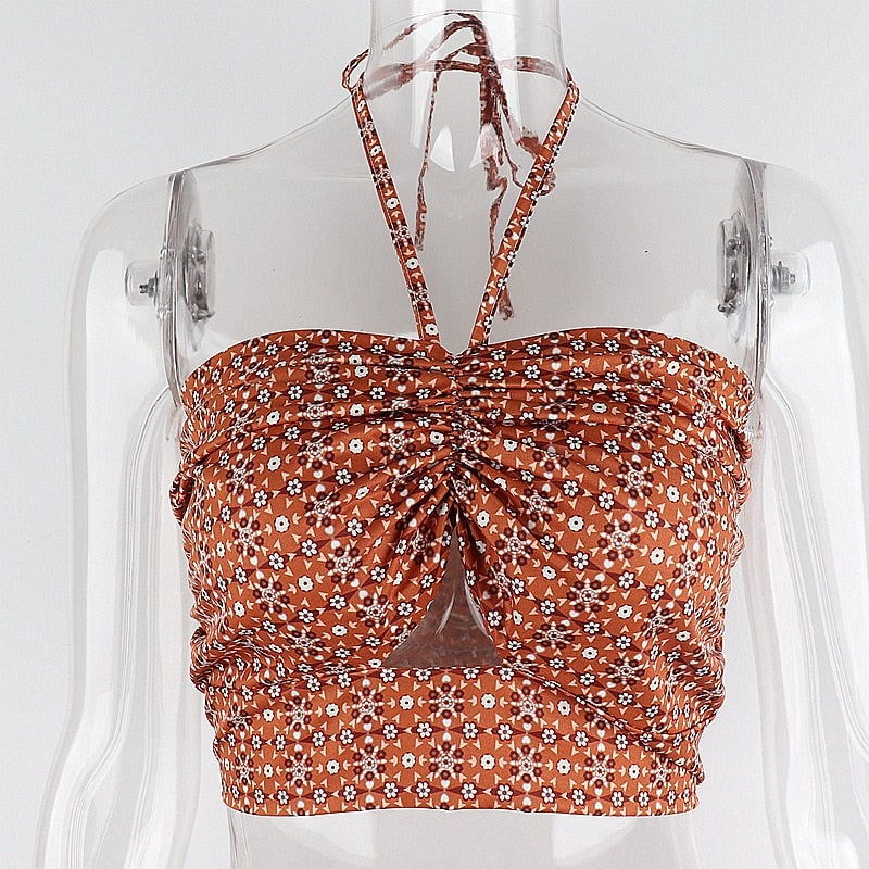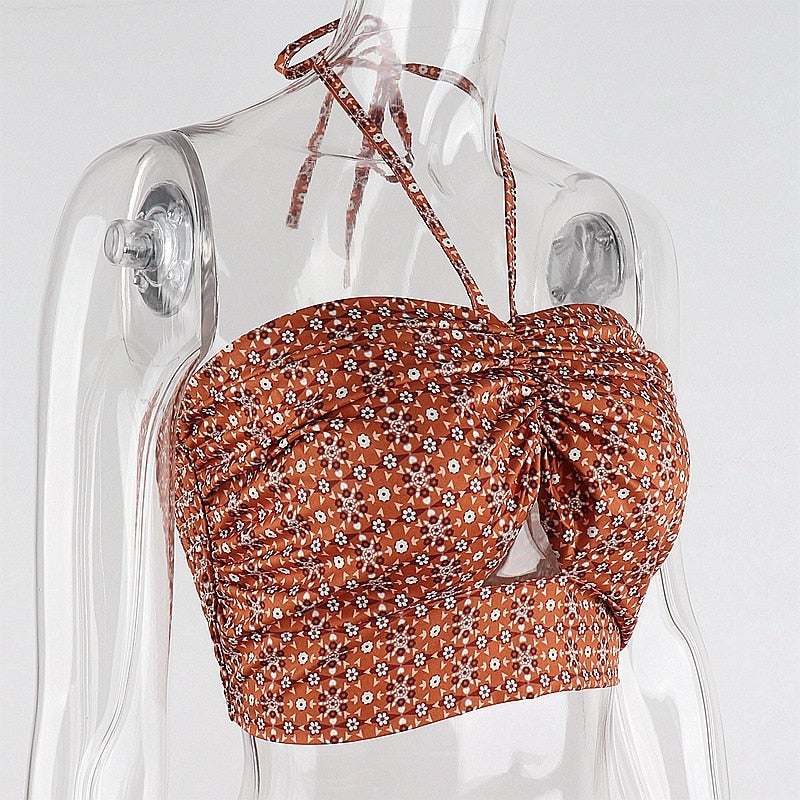 Halter Strap Ruched Style Crop Top with Geometric Flower Pattern