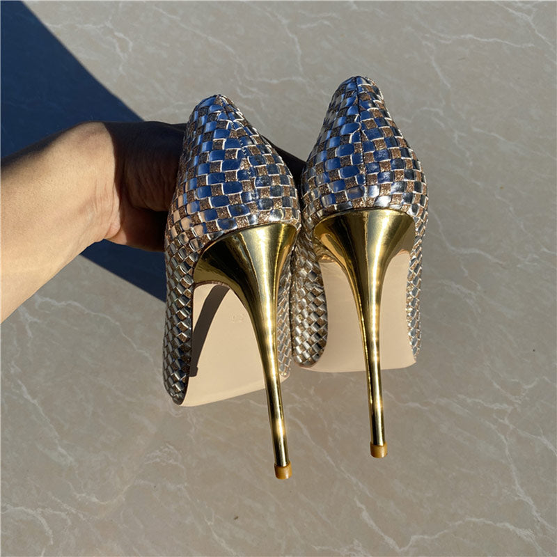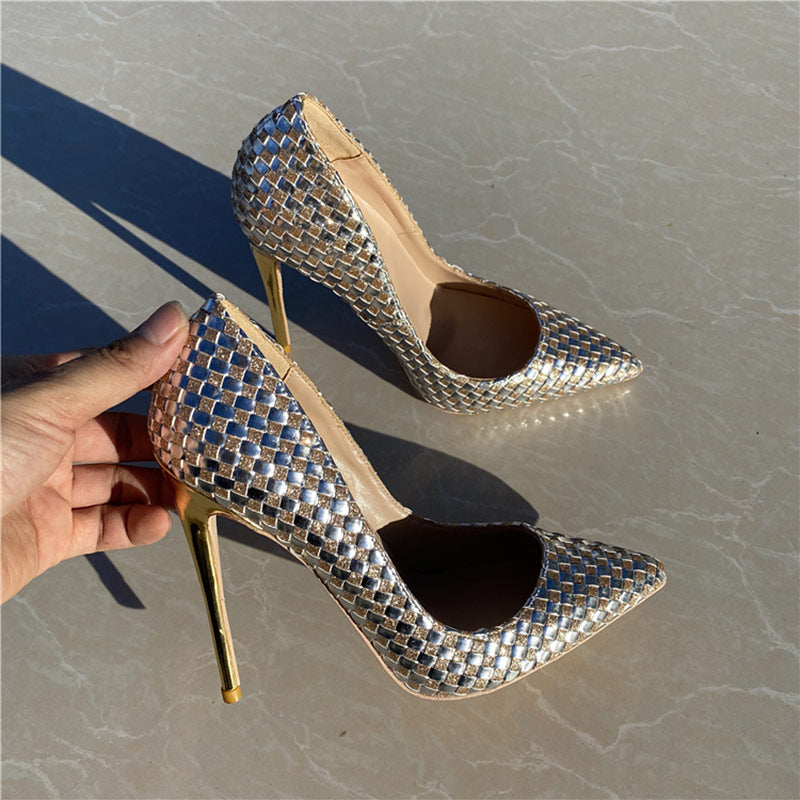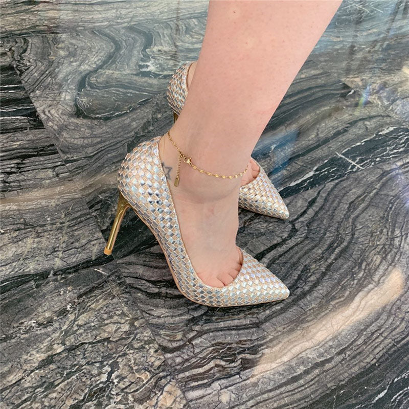 Elegant and easy to wear, this pointed-toe stiletto is sure to become a staple of your sophisticated wardrobe. The woven pattern is designed to complement a wide variety of outfits. The glitter accent adds a hint of glamour and style.