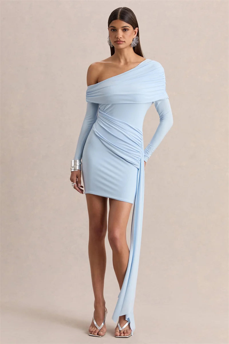 Elevate your evening look with this striking diagonal collar draped ruched mini dress. The asymmetrical neckline creates a sophisticated silhouette, while strategic ruching defines your curves beautifully. Flowing fabric drapes elegantly from the shoulders, offering movement and grace. Perfect for cocktail events, date nights, or when you want to make a bold fashion statement.