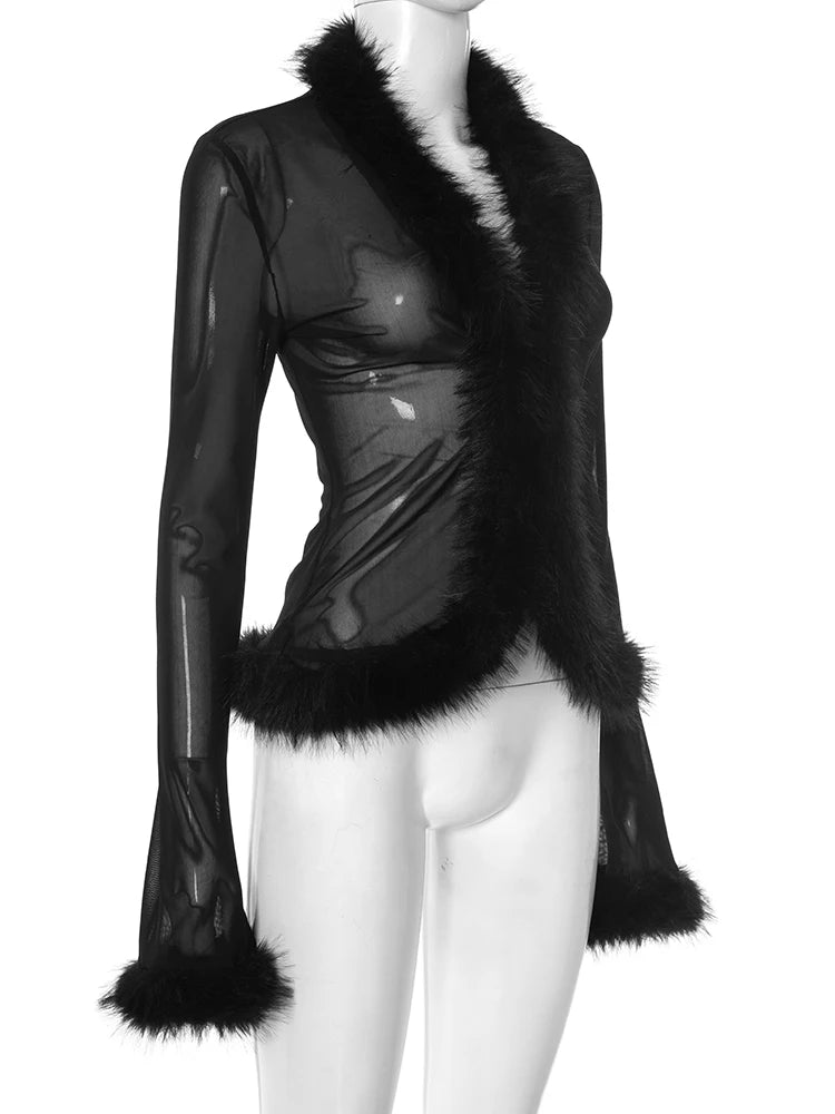 Feral But Feminine Top Unleash your wild side in this provocative black sheer top adorned with luxurious fur detailing. The delicate transparency paired with tactile fur creates an intoxicating contrast that's equal parts seduction and strength. Built for the woman who refuses to be tamed, this piece celebrates the power of embracing your primal nature without apology.