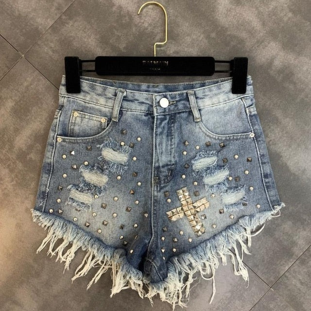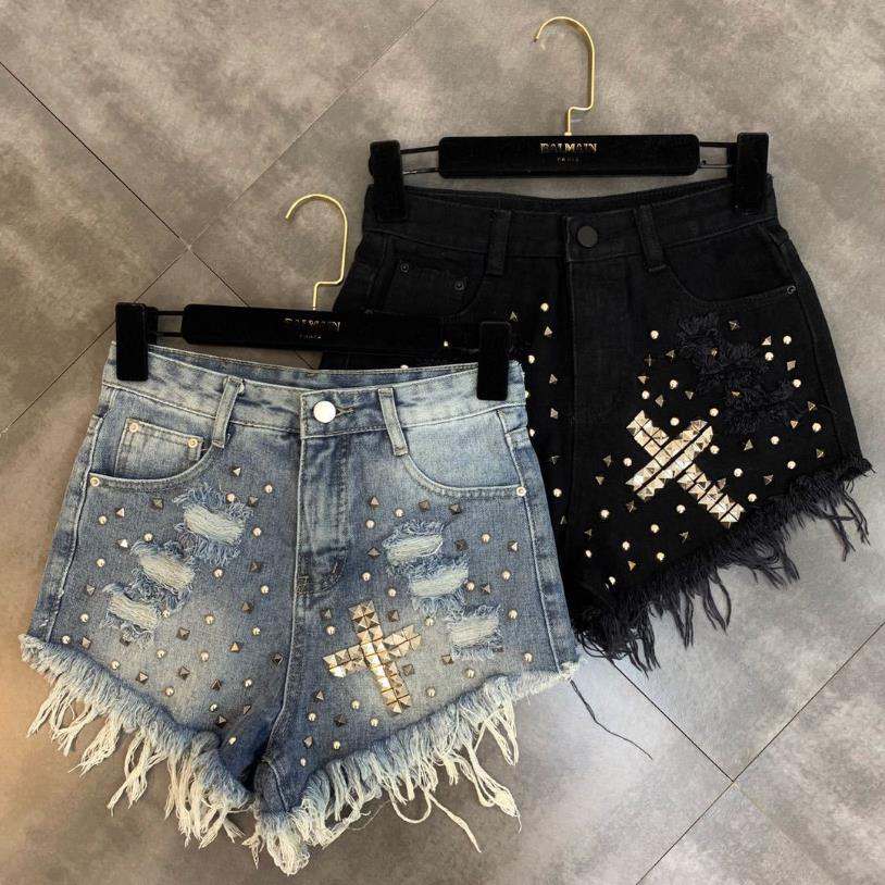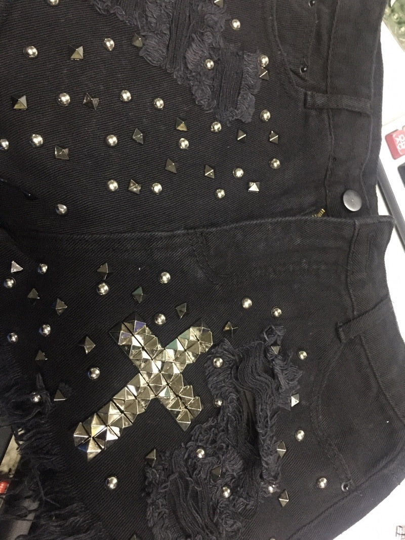 Polyester Cotton on Pocket Zipper Chains Patchwork Denim Short