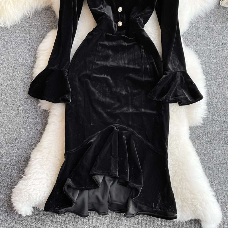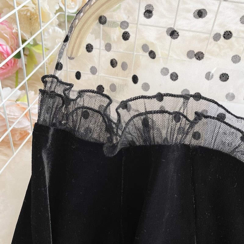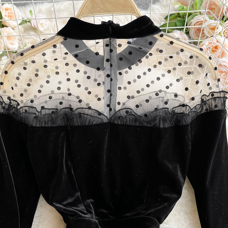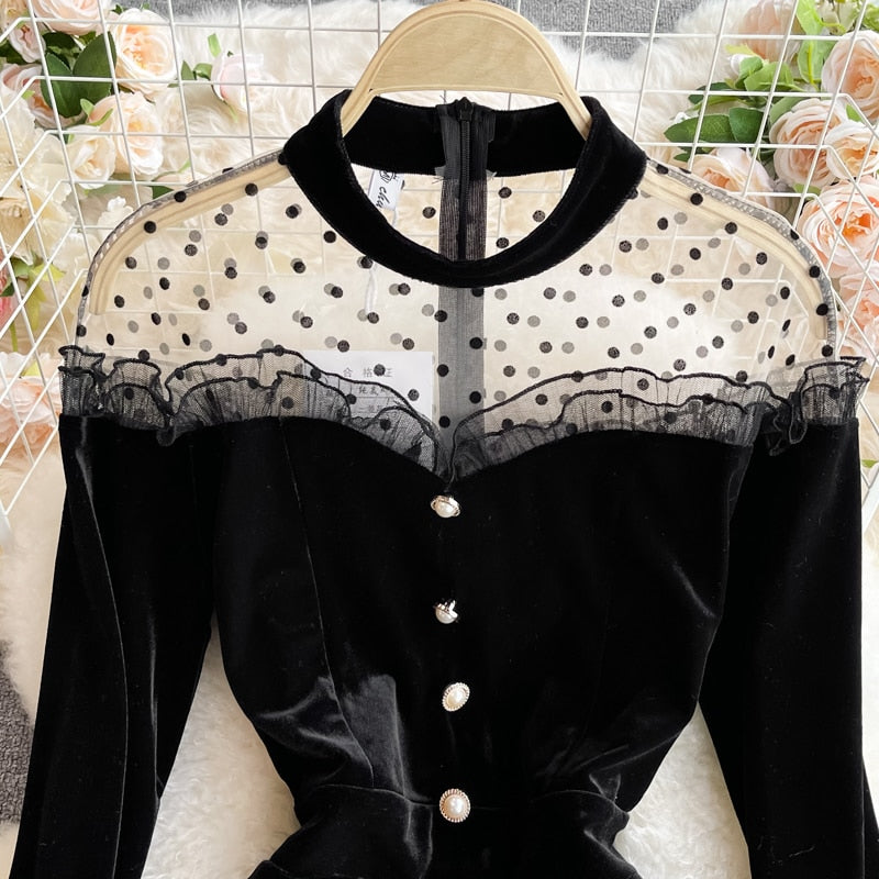 Elegant and stylish, this midi dress is a must-have that will go perfectly with any pumps. This midi dress is made of soft fabric that feels good to wear. Decorated with a button and a little touch of a ruffle.  The shoulder is a see-through fabric with a polka dot pattern.