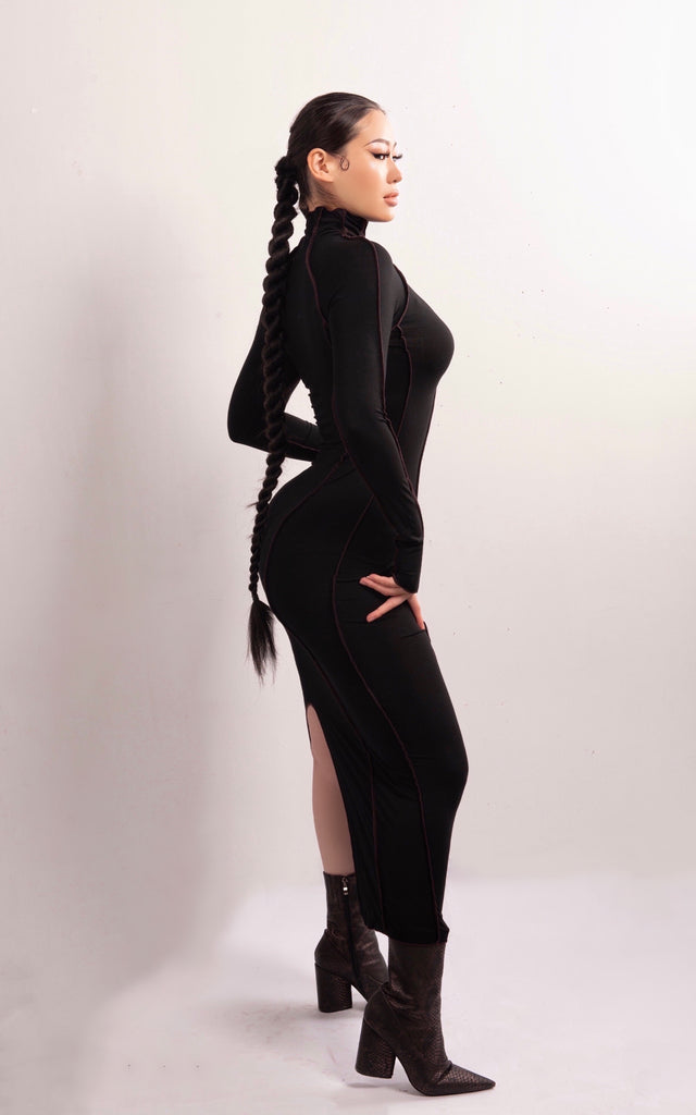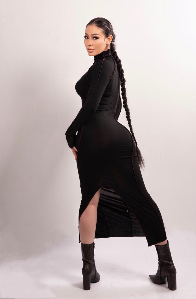 Live life to the full with this stylish sheath dress that is perfect for day or evening wear. The soft fabric is perfect for the cooler months ahead. The sexy dress has a flattering turtleneck collar and slits back.