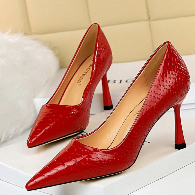 Subtle Crocodile Patterned Pumps with Pointed Toe and Patent Leather Material