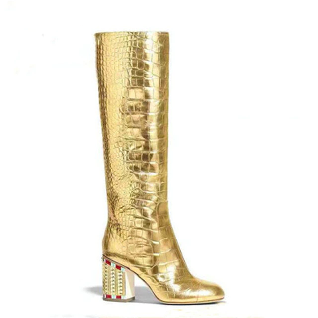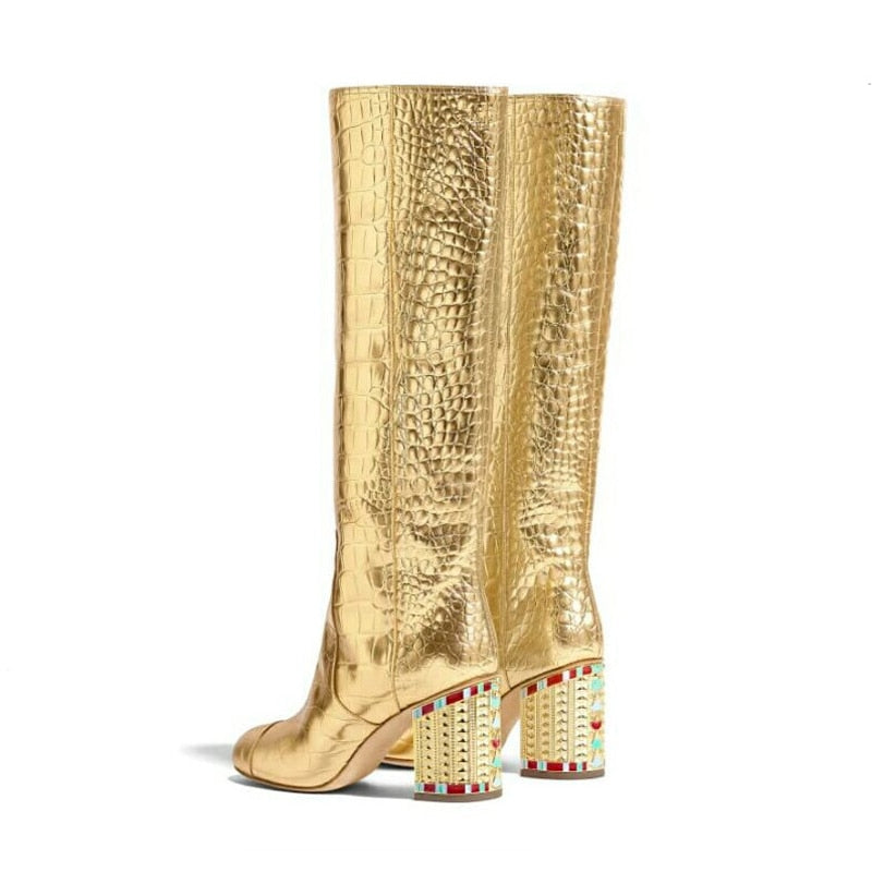 These knee-high boots are the perfect way to inject some glamour into your look. Featuring an edgy snakeskin pattern that is sure to get attention.