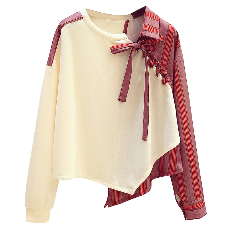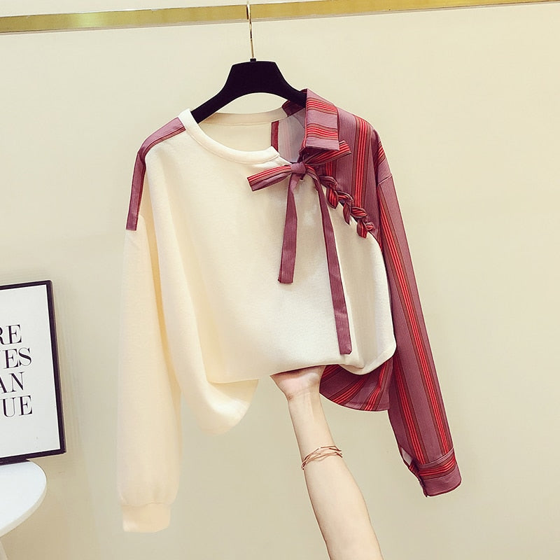 Long-Sleeved Polyester Blouse with One Plaid Stripe Patterned Patchwork Style Sleeve