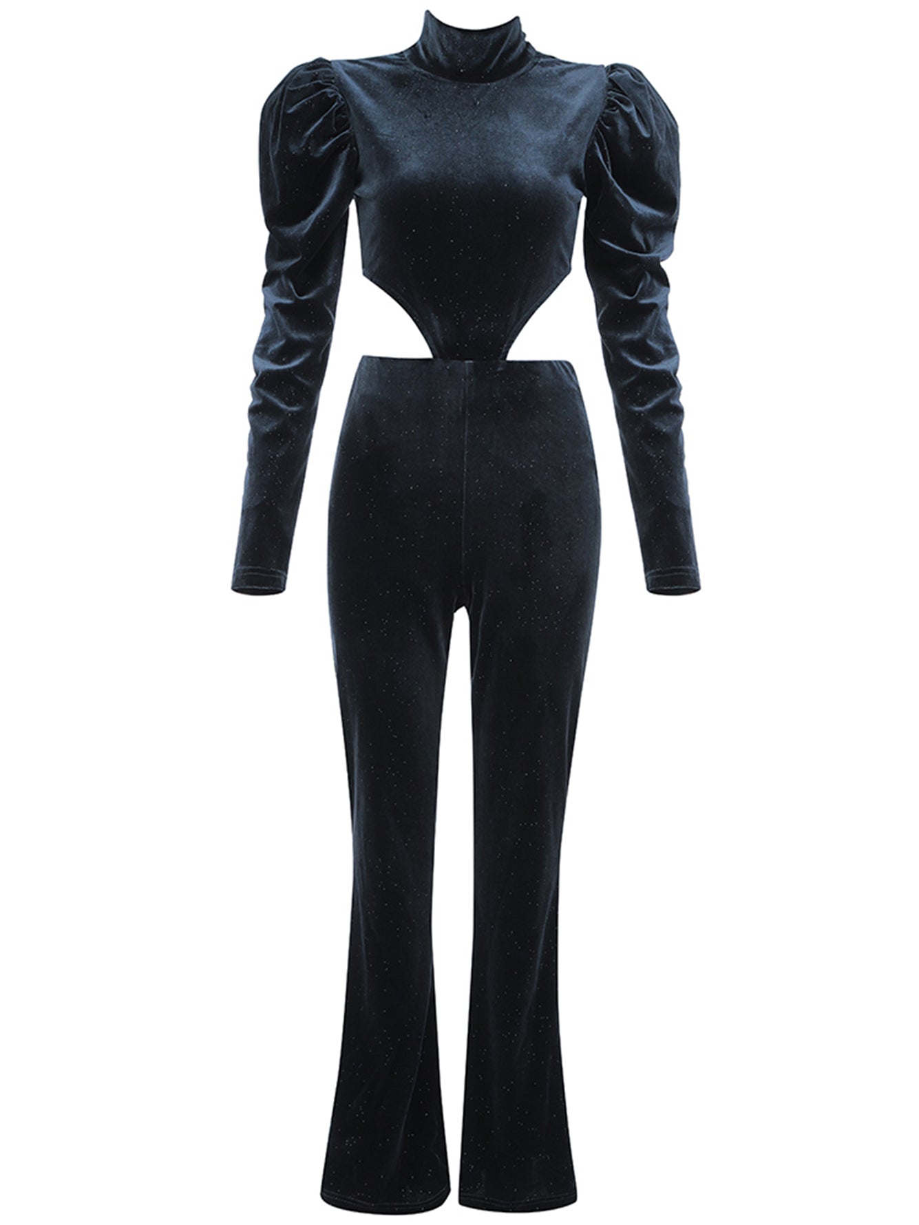 This jumpsuit is made of velvet polyester and spandex material which makes it soft and comfortable. It has a long sleeve style with shoulder puff which gives it an informal look. It has an elegant stand collar and features a hollow-out waist style. It has wide-leg pants which give you a comfortable fit. This trending jumpsuit is perfect for daytime leisure.
