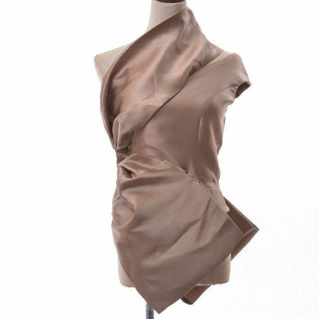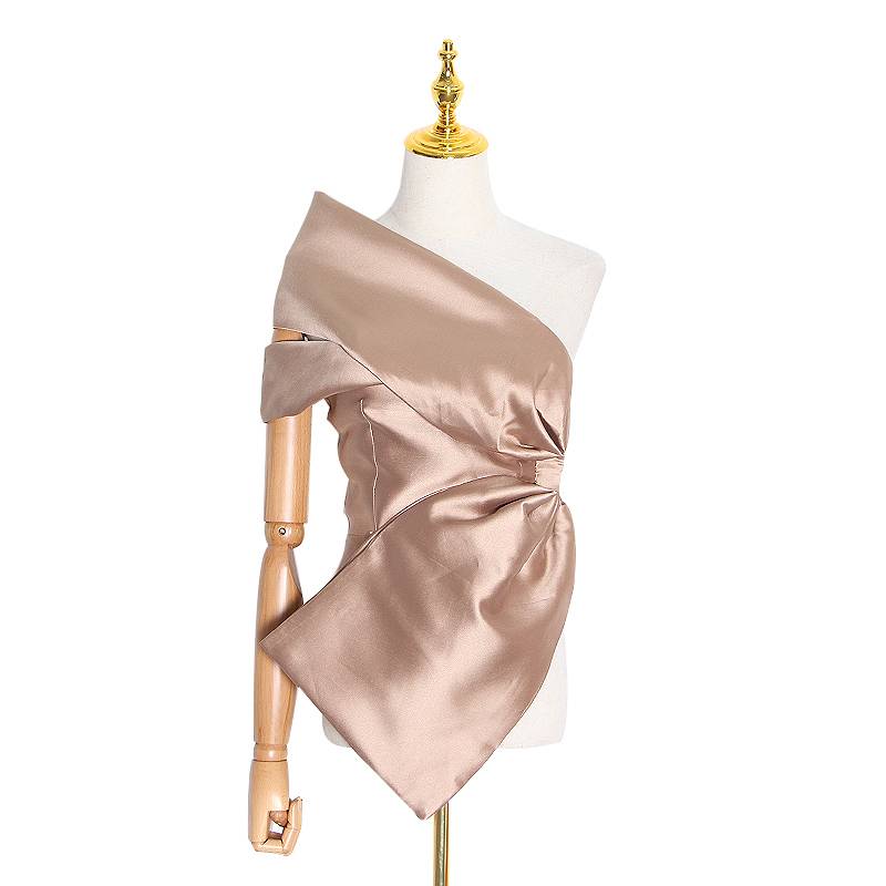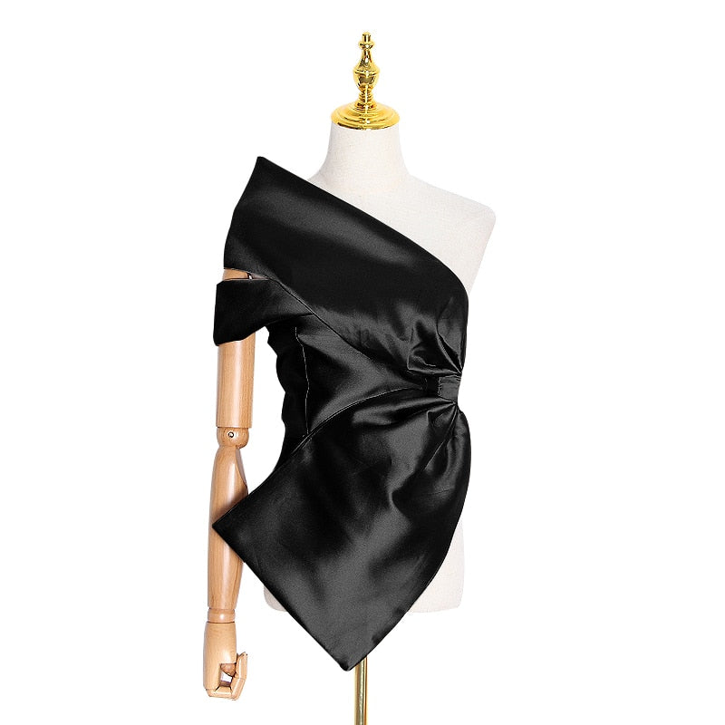 Solid Pattern Partywear Top With Skew Collar And Huge Ribbon Decoration